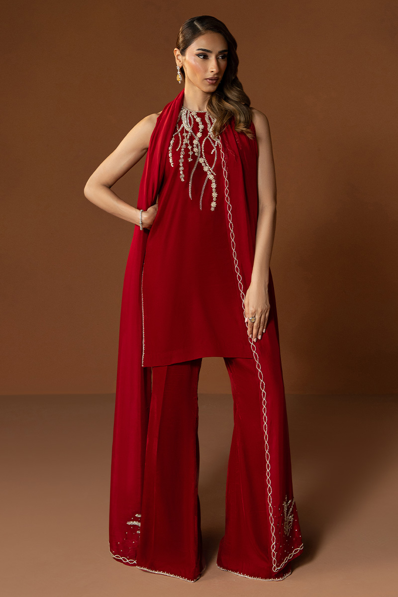Achieve an ethereal charm in this deep red velvet outfit. The short shirt is beautifully detailed with intricate embellishments around the neckline, showcasing refined at its finest. Paired with elegantly tailored boot-cut pants and a fluid medium silk dupatta detailed along the borders, Allure is a true reflection of modern grace.