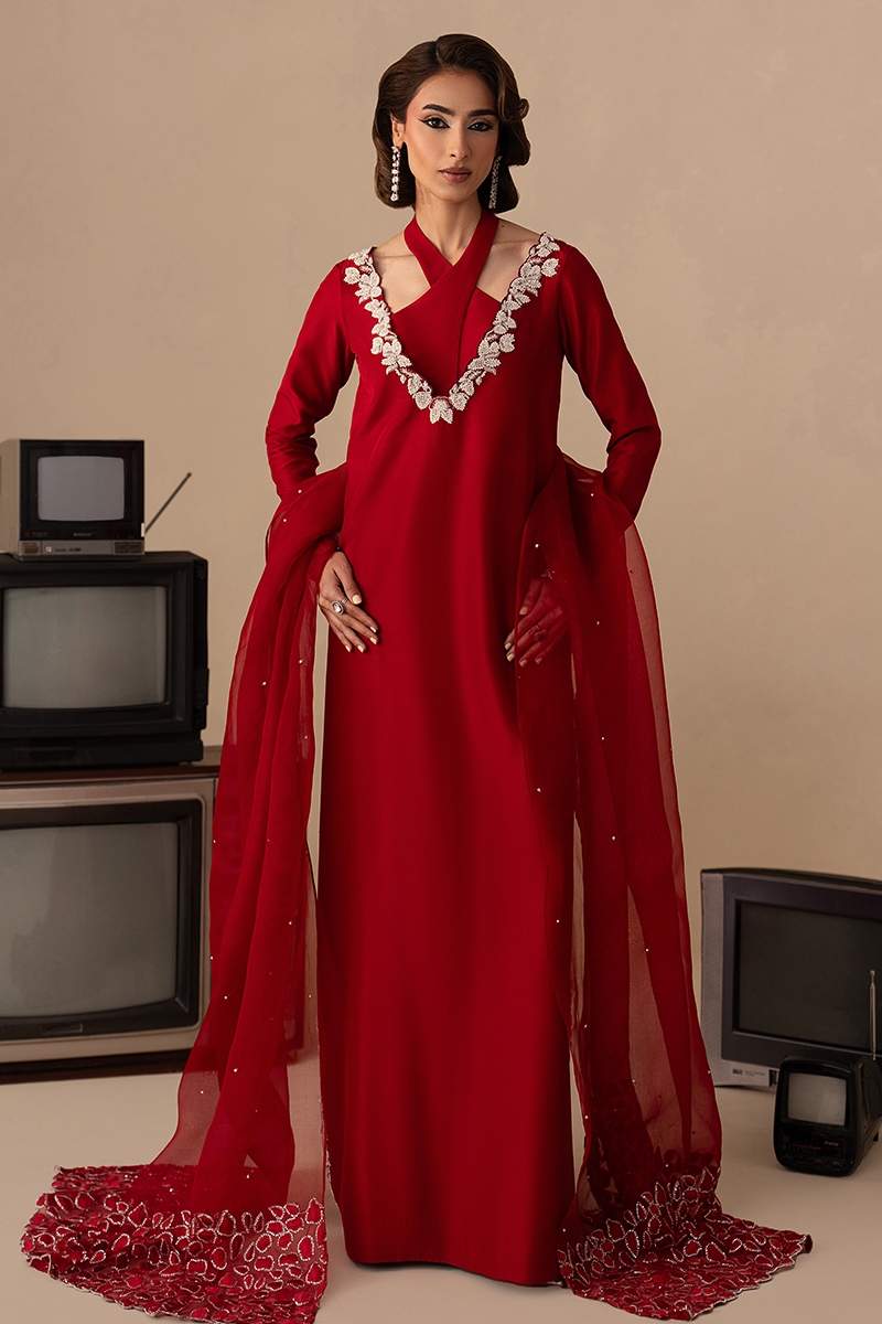 The Pure Raw Silk/Korean Raw Silk cross-bustier long shirt is detailed with hand embellishment on the neckline, sleeves, and slit, paired with straight trousers and an organza dupatta finished with machine-embroidered borders.