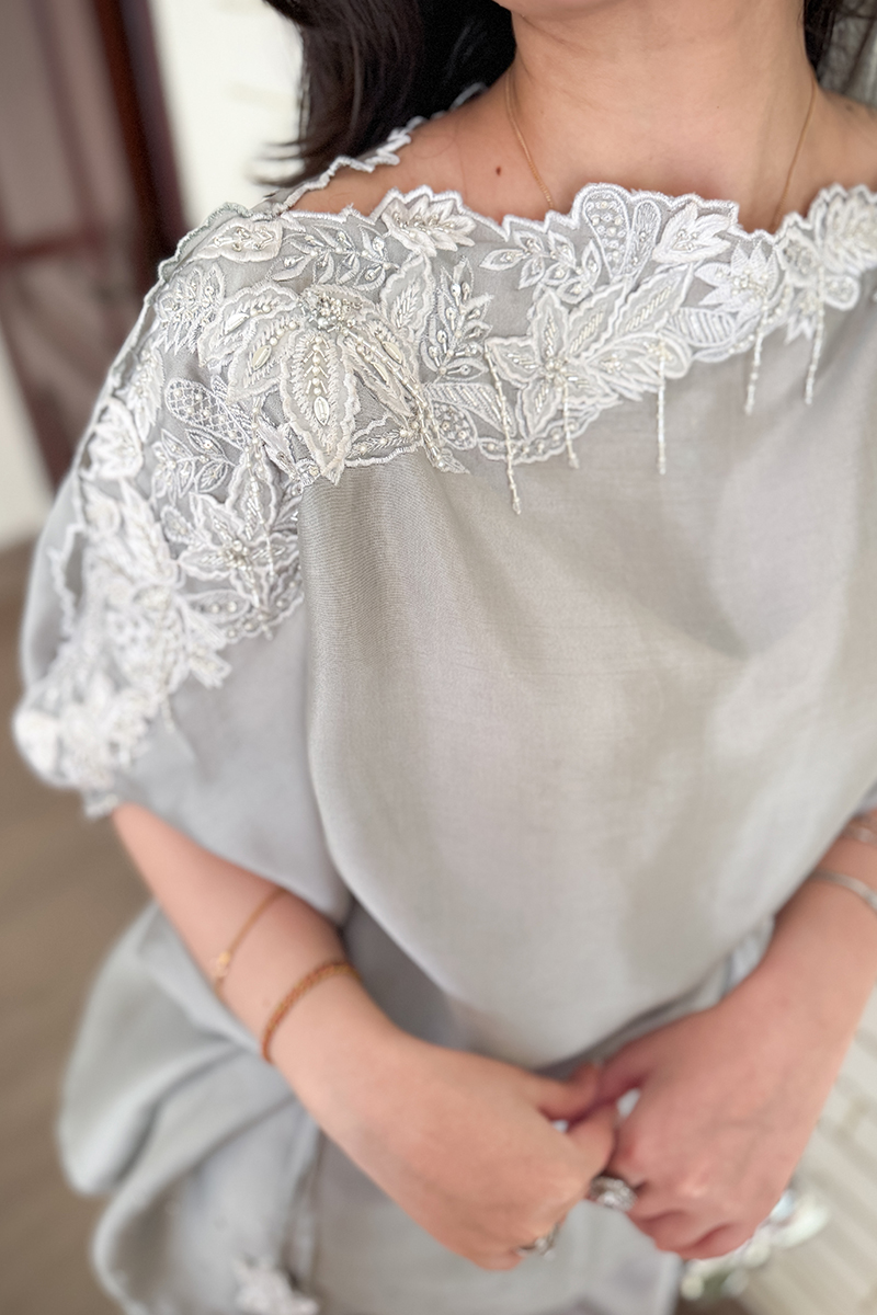 This grey drop-shoulder outfit is crafted from luxurious sheesha silk, featuring a delicately embroidered neckline with Swarovski detailing along the border. The look is beautifully finished with 3D butterflies and floral accents on the belt, adding a soft, feminine touch.