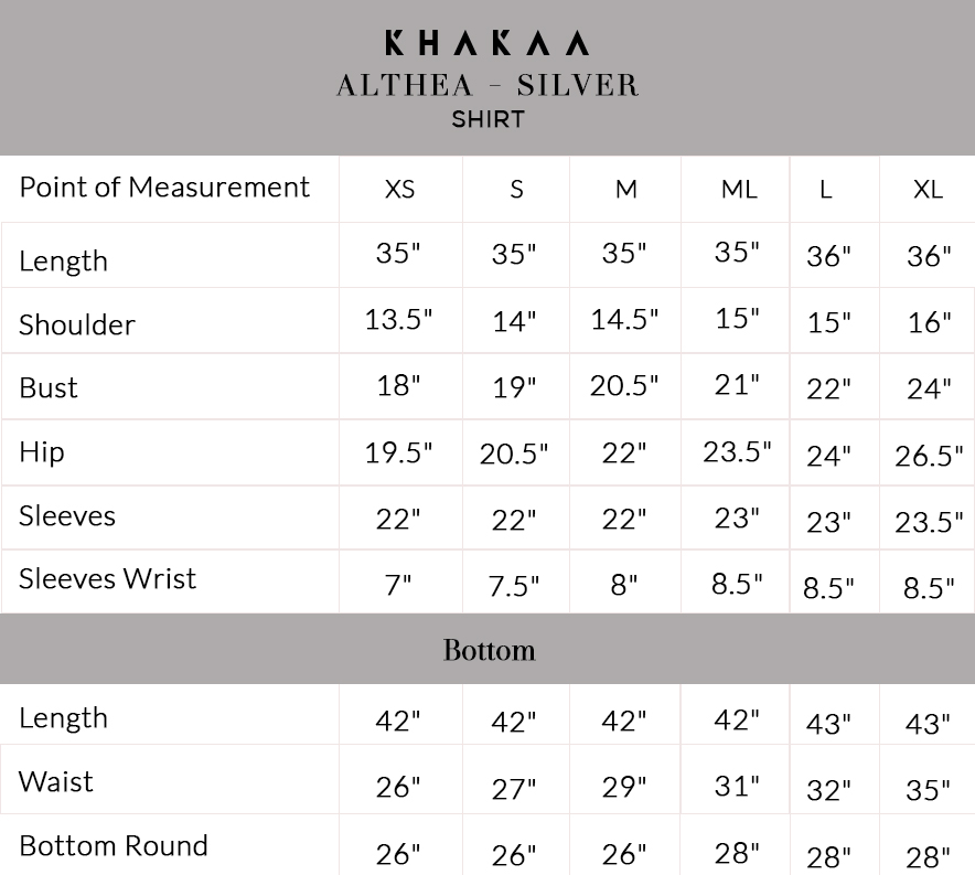 Crafted in luminous silver pure raw silk, Althea redefines modern elegance with a short tailored shirt and boot-cut pants, paired with an organza dupatta finished with pearl pleating along the hem for a statuesque silhouette. The ensemble is elevated with intricate hand embellishments of pearls, beads, cut dana, and silver chains, striking the perfect harmony between refined detail and extreme luxury.
