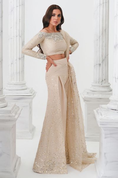 A quirky floral pattern is carved with extraordinary precision and detail on an ivory pure raw silk canvas. 'Amber' is highlighted with detailed embroidery expertly crafted on the off-the-shoulder top (Bardot top), which is accentuated with embellishments with a color blend of two types of cut dana (Naqshi and Dabka) that appropriately mirror the fall brilliantly colored foliage that expresses warmth, comfort, and tranquility to create an array of exquisite details to perfection. The look can be completed with an organza embroidered dupatta and diaphanous black pure raw silk pants embellished with sequins and pearl crystals of various sizes in gold and silver. Beautiful, elegant, and genuinely khakaa!