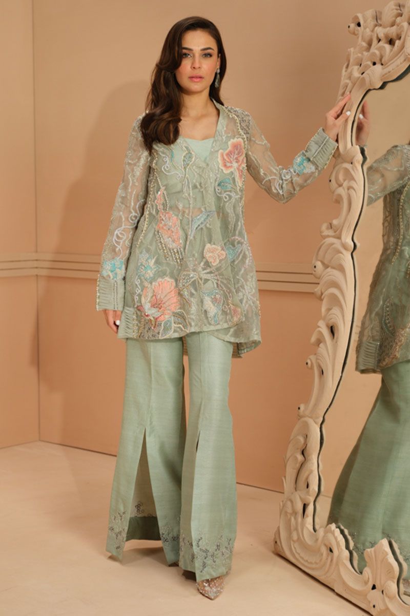 A Korean raw silk shirt embroidered with gold, carnation pink, fiery rose, aureolin, and spruce colors with crystal stone leaves. This shirt is displayed on a Russian violet canvas inspired by the fuchsia flower which embodies deep love, elegance, trust, and healing. This attire is paired with loose pants with exquisite gold and white filigree detailing complementing the shirt's look with a modern yet sophisticated vibe.