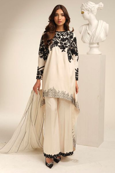 "Dove," an epitome of elegance, features an off-white palette adorned with black resham and tilla embroidery. The modern neckline, sleeves with a bold shoulder bunch, and a contemporary cut shirt with a trailing tail showcase a refined aesthetic. Asymmetric horizontal lines embellished with kat-dana, and crystals run along the shirt's border, while bell-bottom pants and a pleated organza dupatta with sequin-shiny black sheets and mini tassels complete this ensemble, harmonizing modern opulence with classic allure.