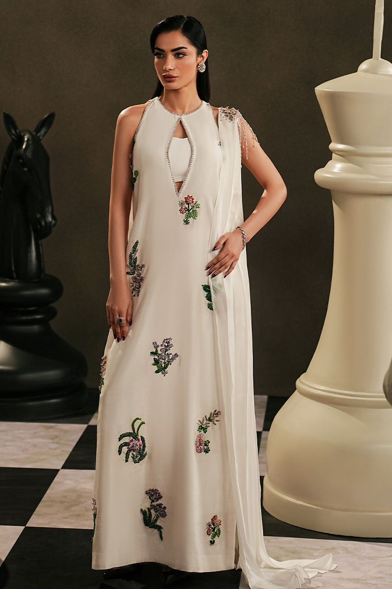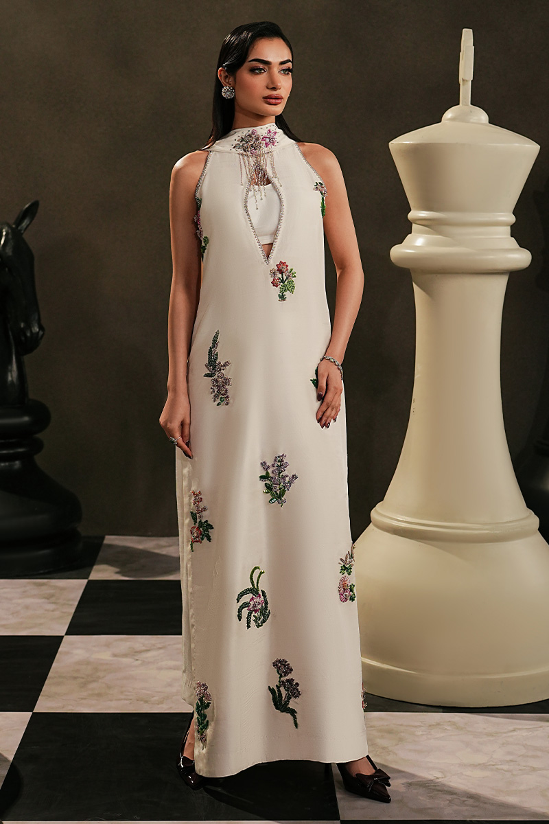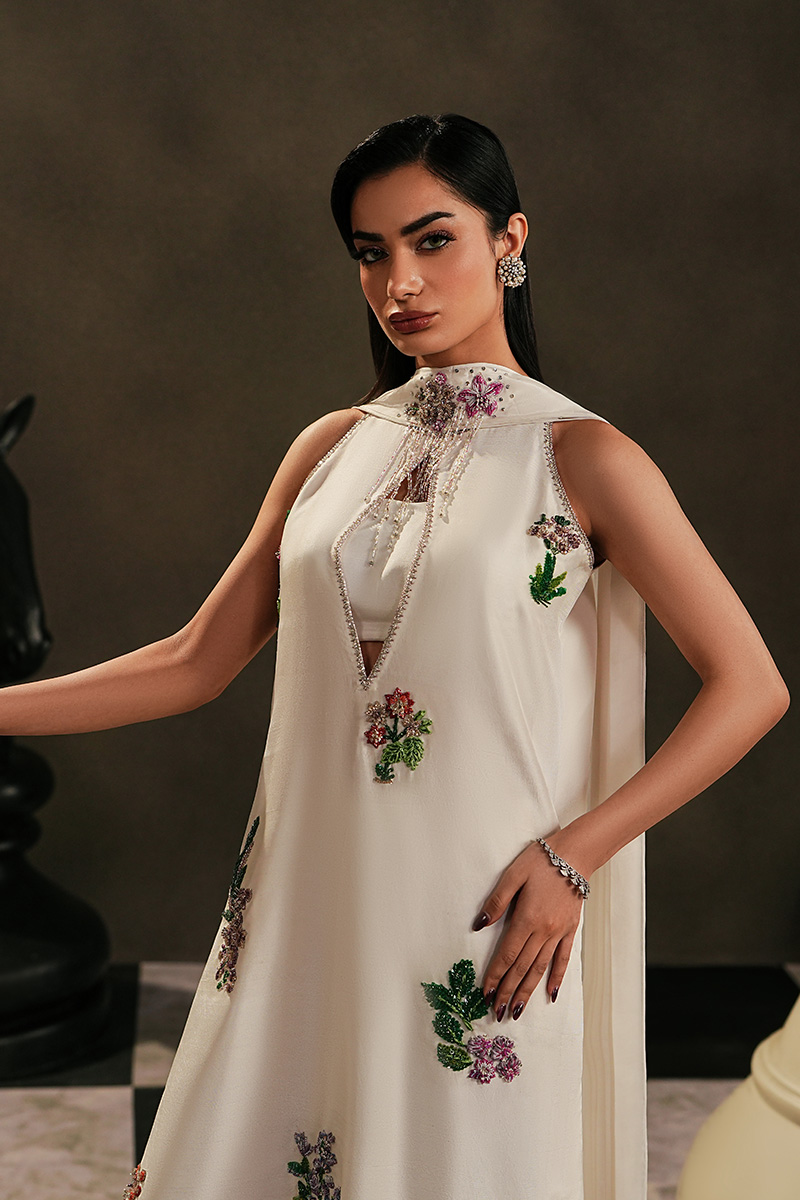 A look that fits effortlessly into our festive wardrobe.Pure Silk/ Tussel Silk gives EIRA its ease, while the keyhole neckline adds quiet character. Cut dana floral work appears delicately across the shirt, offering just enough ornament without feeling heavy. Straight trousers keep the look grounded, and the skinny pleated dupatta, finished with a soft motif, brings movement and lightness.