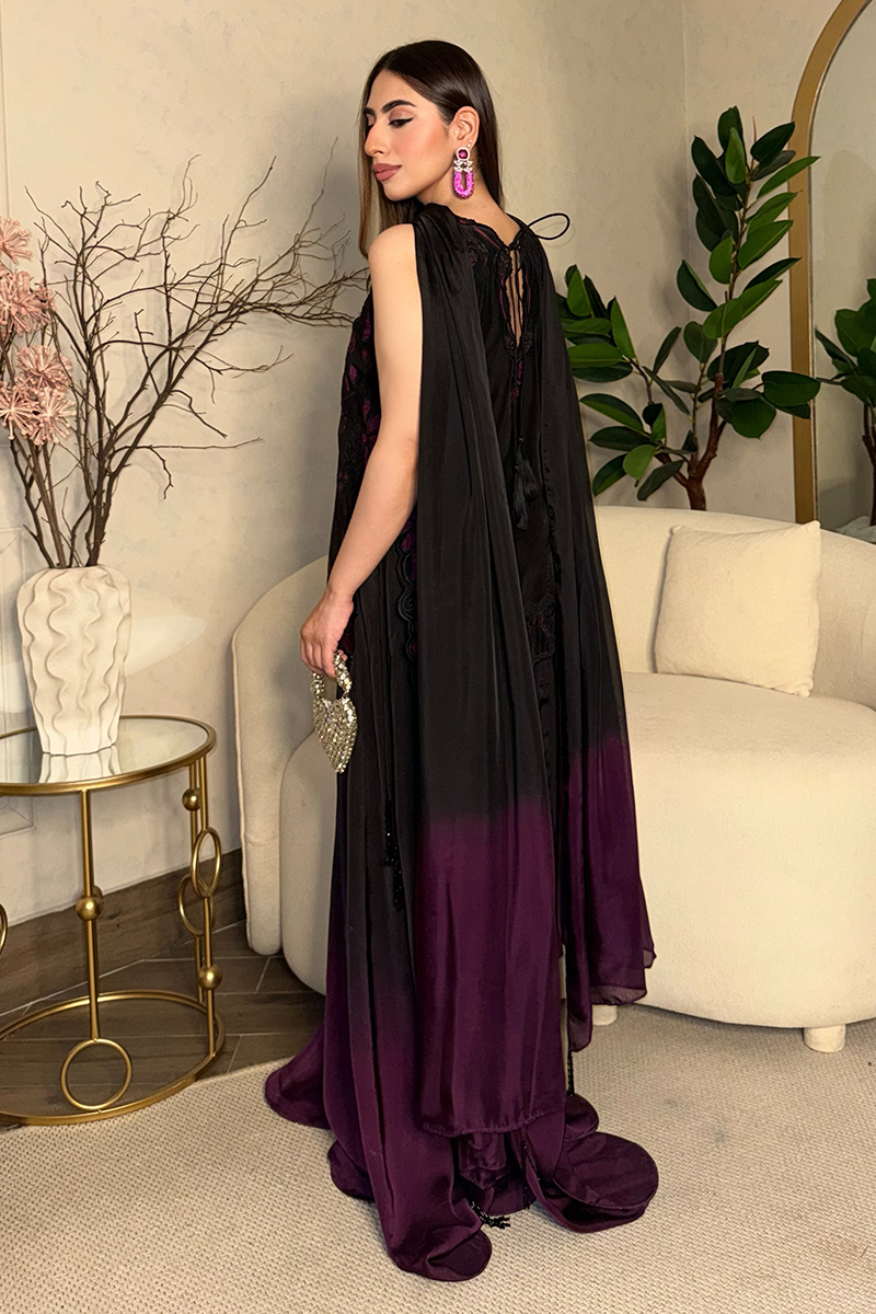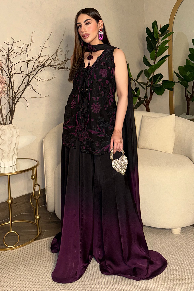 This look features a short jacket shirt crafted from luxurious Korean raw silk, adorned with intricate embroidery and delicate tassels. Paired with flowing shamoze silk flared pants in a rich black-to-purple ombré, the silhouette creates a striking yet graceful statement.Finished with a medium silk dupatta, detailed with tassels for that perfect festive touch.