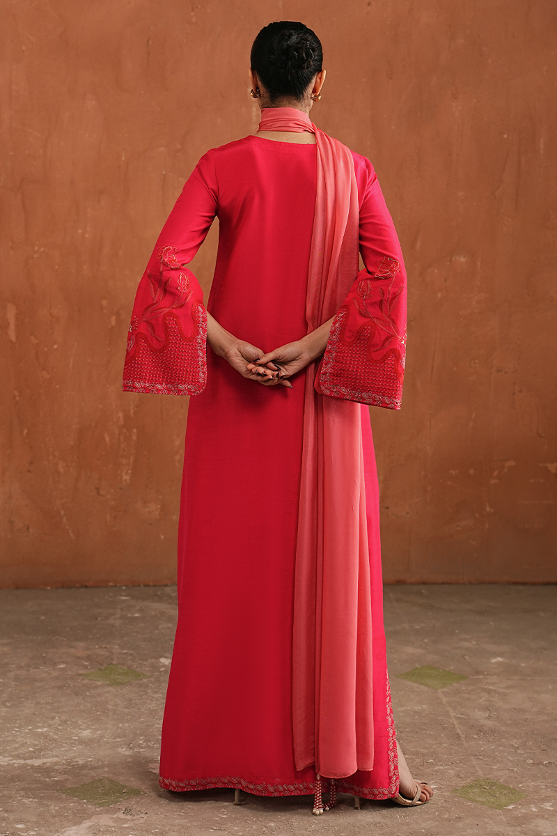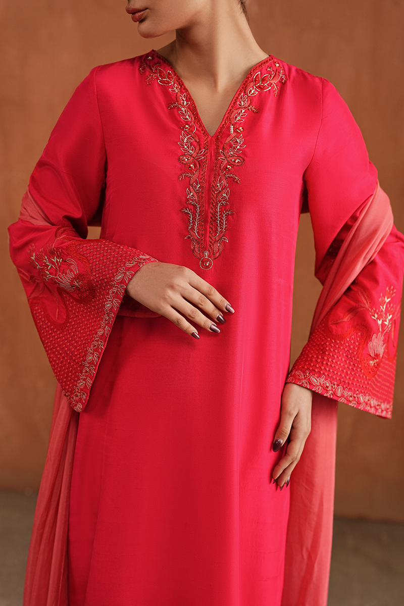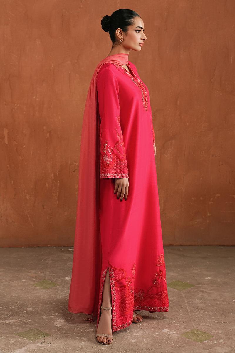 A long kaftan crafted in Korean Raw Silk, paired with straight trousers for an easy, balanced look. Embroidery and delicate embellishments frame the neckline, sleeves, and border, adding detail without overpowering the silhouette. Finished with a medium silk dupatta, softly draped and finished with tassels, Evania is designed for composed Ramadan evenings and understated gatherings.