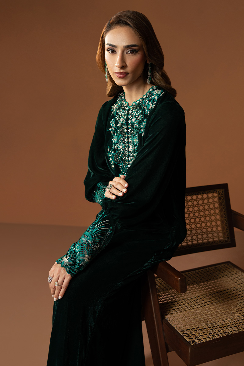 Draped in a long kaftan, a deep, regal green color, Giselle has intricately adorned detailing gracing the neckline and cuffs, adding layers of sophistication. Paired with sleek cigarette pants, it’s a portrait of effortless elegance and quiet grandeur.