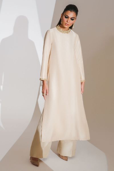A long straight shirt is paired with wide boot-cut pants made in raw silk. Chain impressions are made with gold and silver handwork using dabqa, naqshi, and cut dana, creating a jewelry impact around the neckline and sleeve edges.