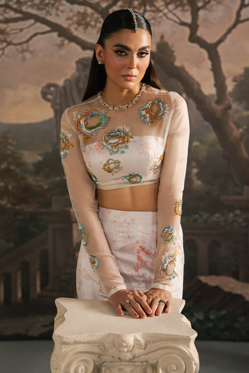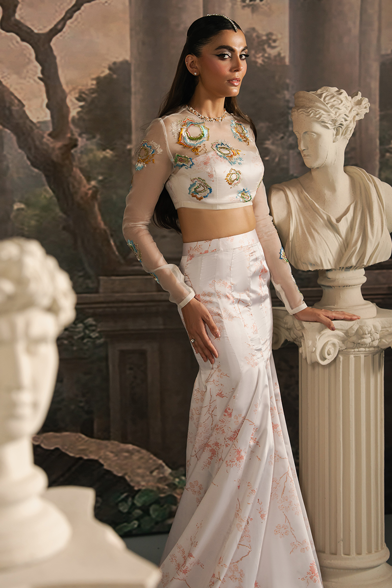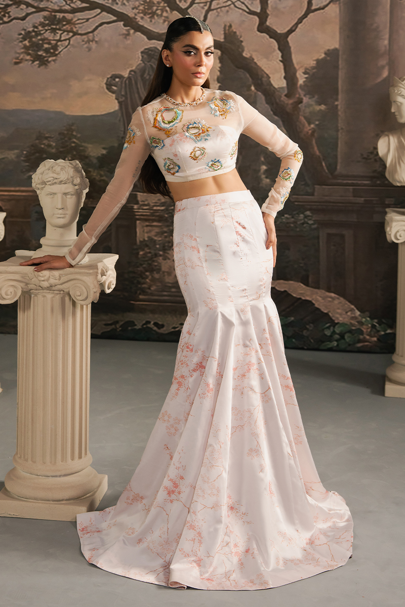 This majestic ensemble is a true symphony of elegance, embodying sophistication and allure in every detail. The figure-enhancing digital printed shamooz silk fishtail silhouette, paired with a finely Embellished blouse, radiates timeless charm enriched with luminous hand embroidery of crystals and cutdana, transforming simplicity into artistry. Cascading pearls weave through delicate floral motifs, flowing gracefully down the skirt like a celestial cascade, evoking an aura of ethereal grandeur
