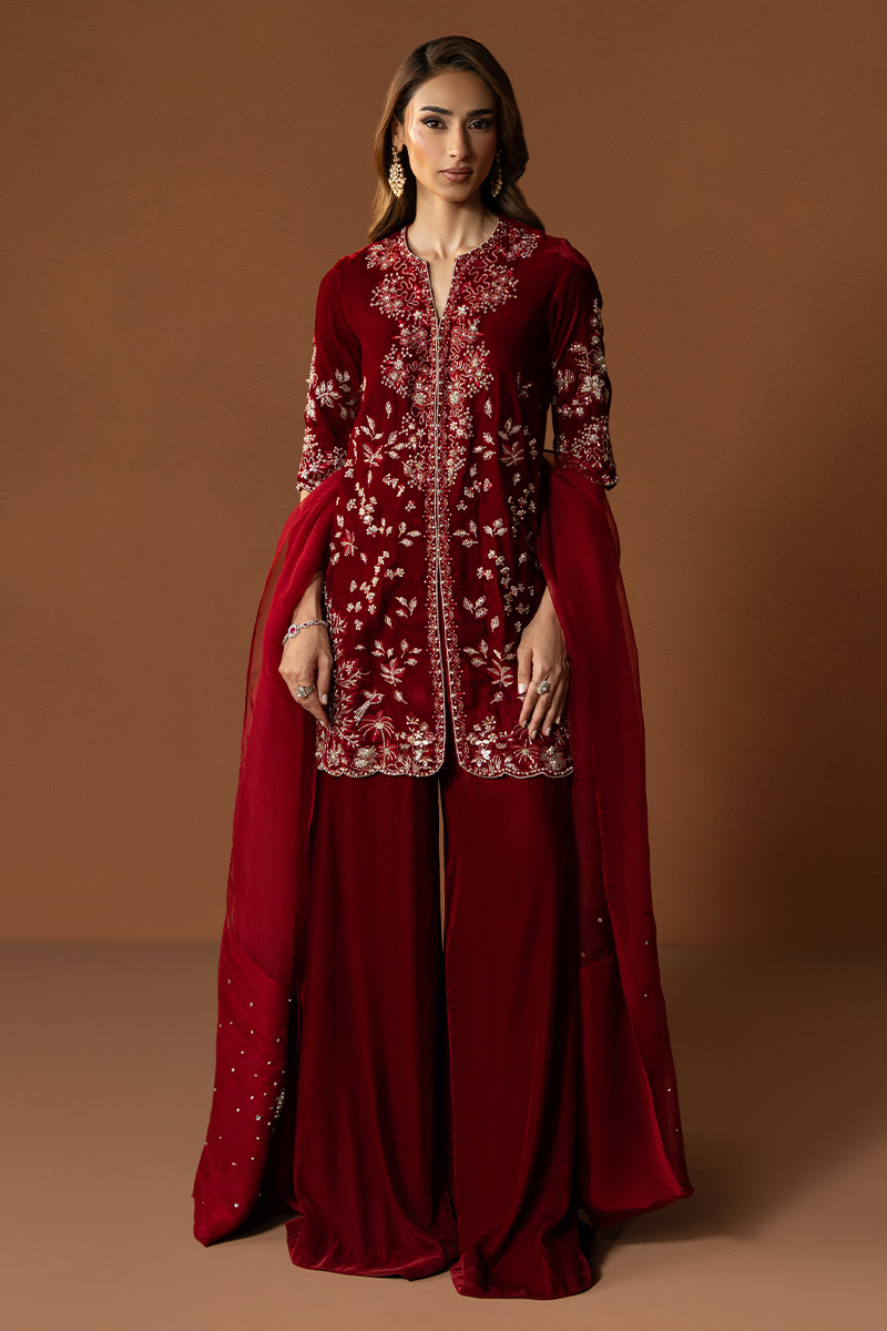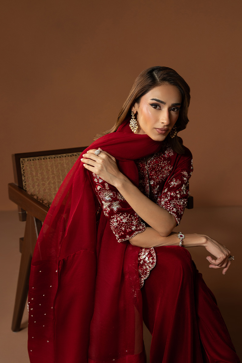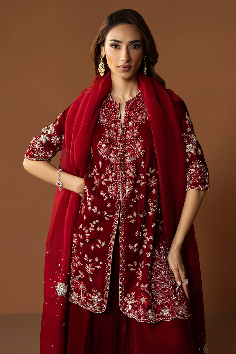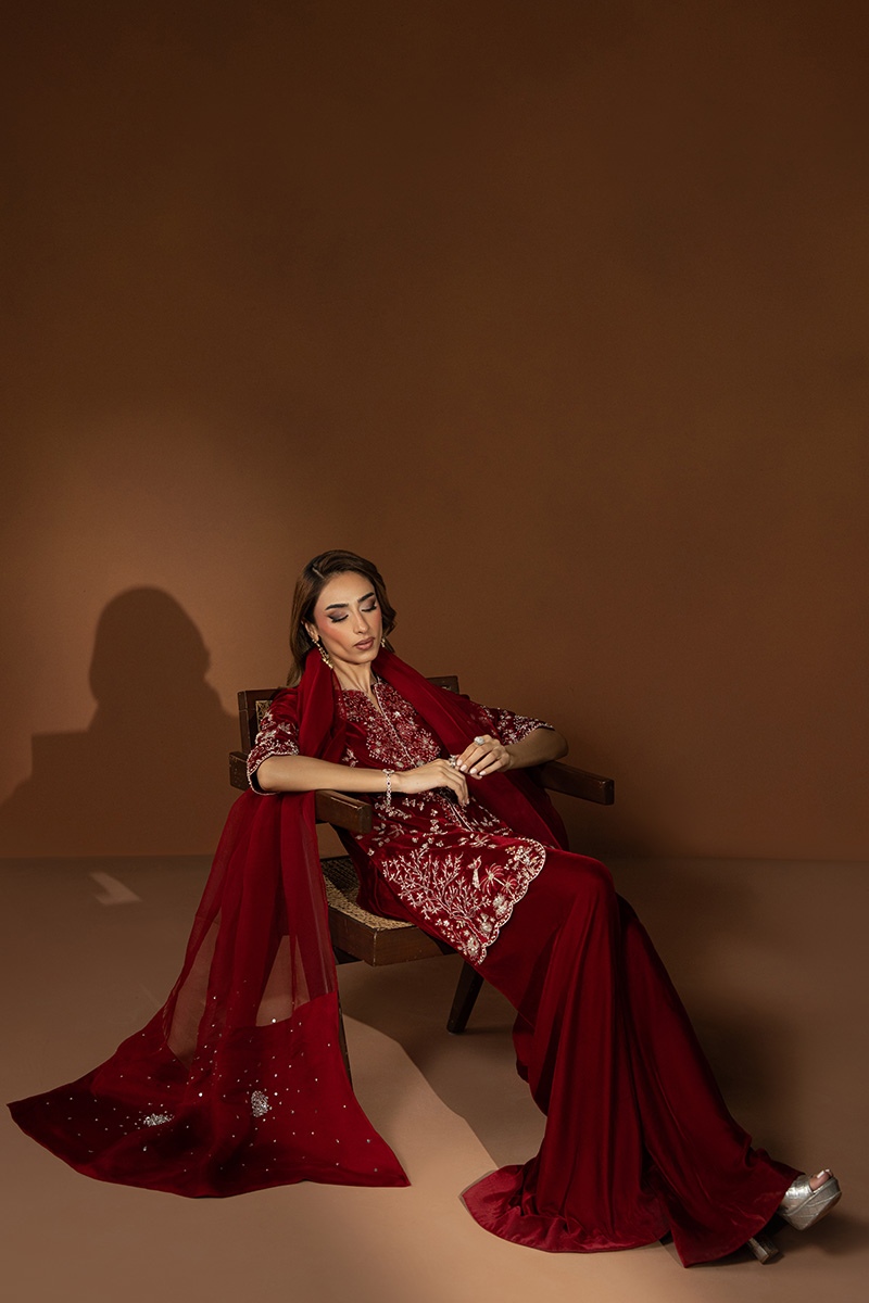 In a rich burgundy hue, Marquis embodies the essence of winter arrival. The short front-open velvet gown is detailed with heavy embellishments, reflecting timeless craftsmanship and regal charm. Paired with flared pants that lend graceful movement and a finely worked two-sided bordered dupatta, this outfit is a perfect blend of warmth, luxury, and enduring elegance.