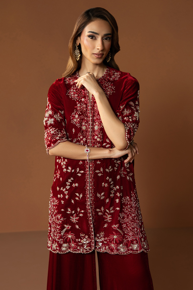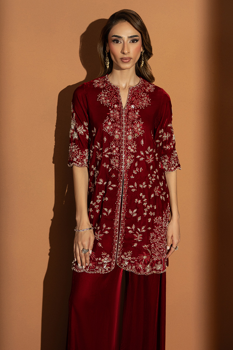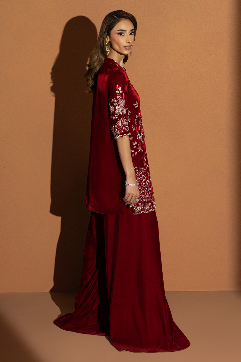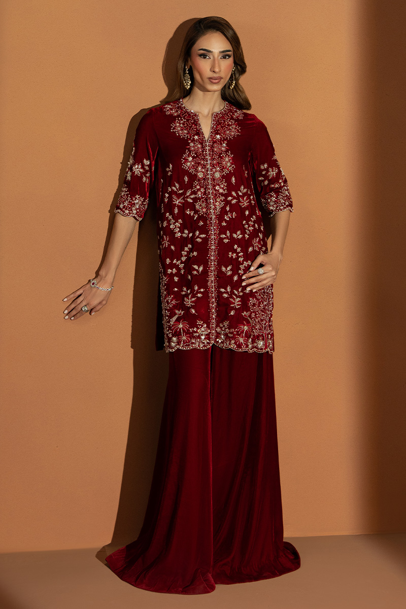 In a rich burgundy hue, Marquis embodies the essence of winter arrival. The short front-open velvet gown is detailed with heavy embellishments, reflecting timeless craftsmanship and regal charm. Paired with flared pants that lend graceful movement and a finely worked two-sided bordered dupatta, this outfit is a perfect blend of warmth, luxury, and enduring elegance.