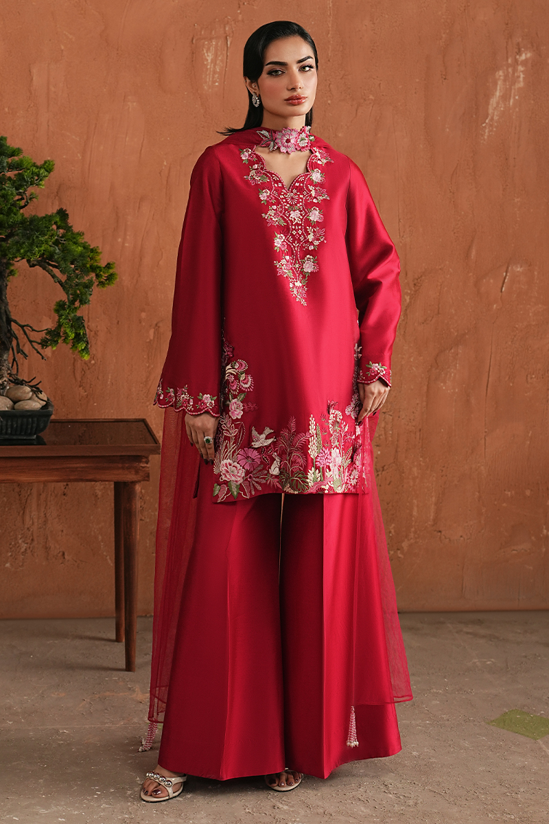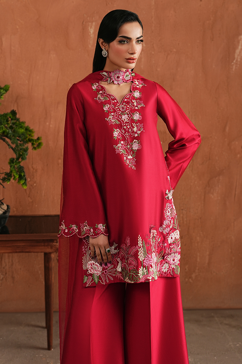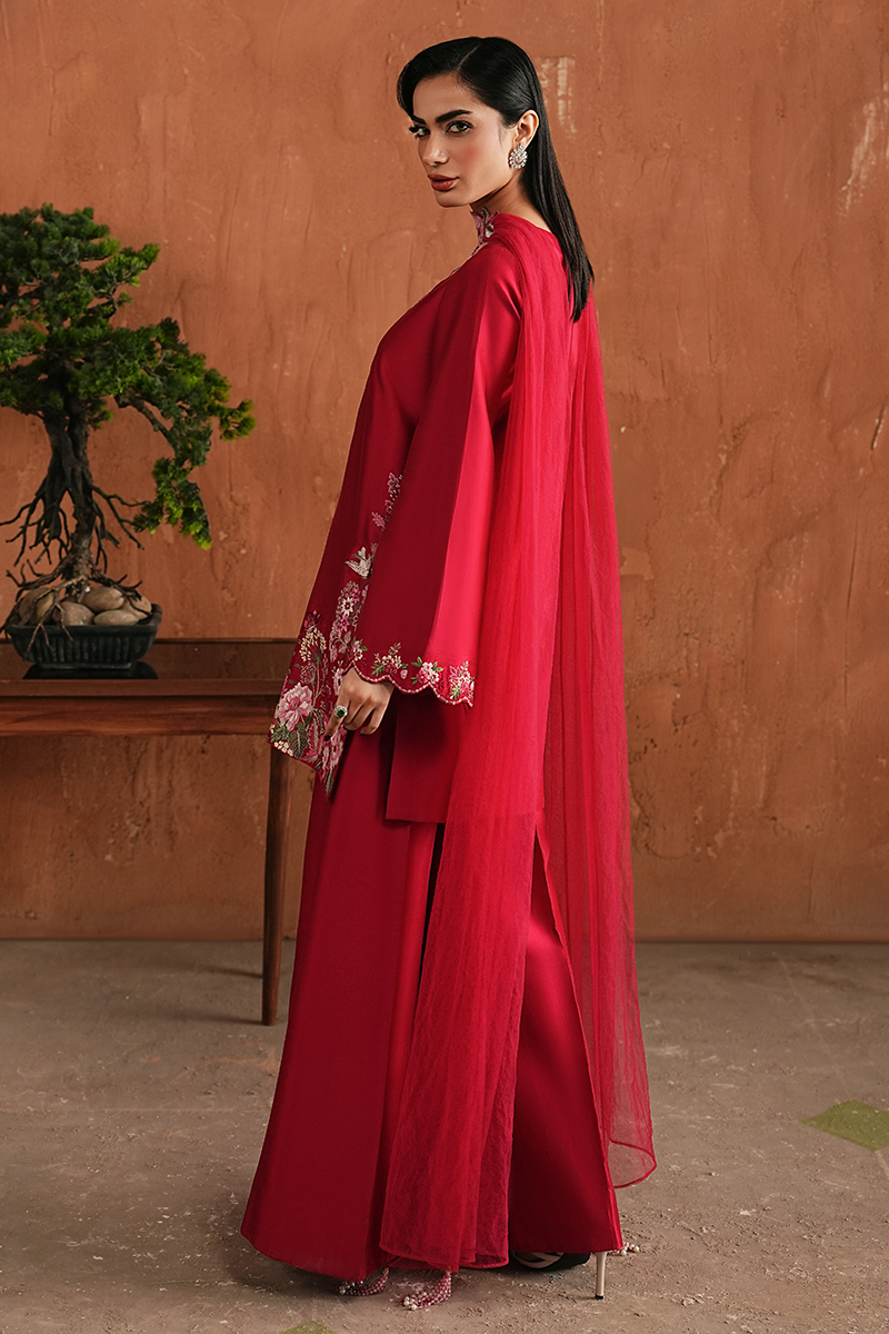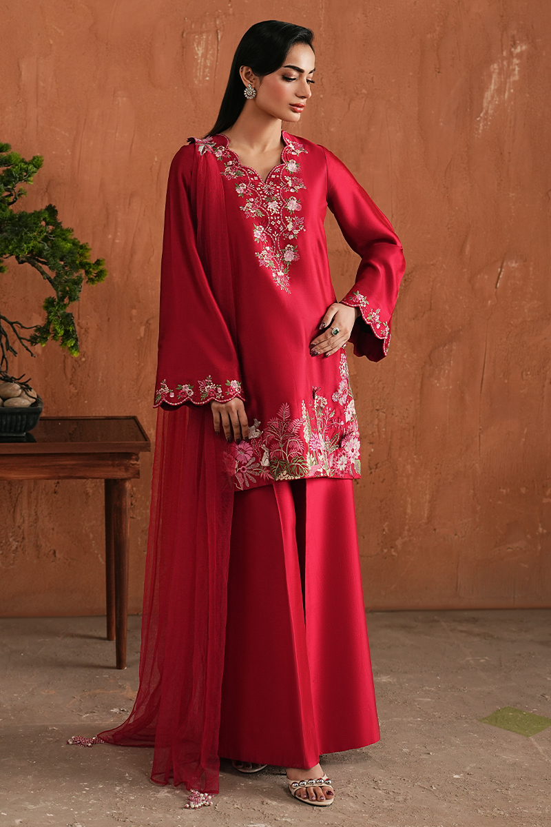 Merlot Favourite pick of our creative designer.A deep pink tone sets the mood for this look. The short Korean Raw Silk shirt is finished with intricate hand embroidery along the neckline, sleeves, and borders, giving the piece its character and depth. Paired with flared trousers for a graceful fall, the look is completed with a finely pleated net dupatta, detailed with the same motifs as the shirt.