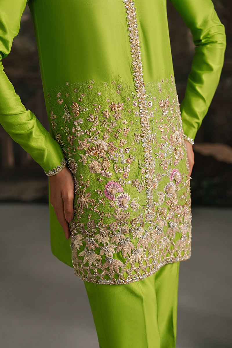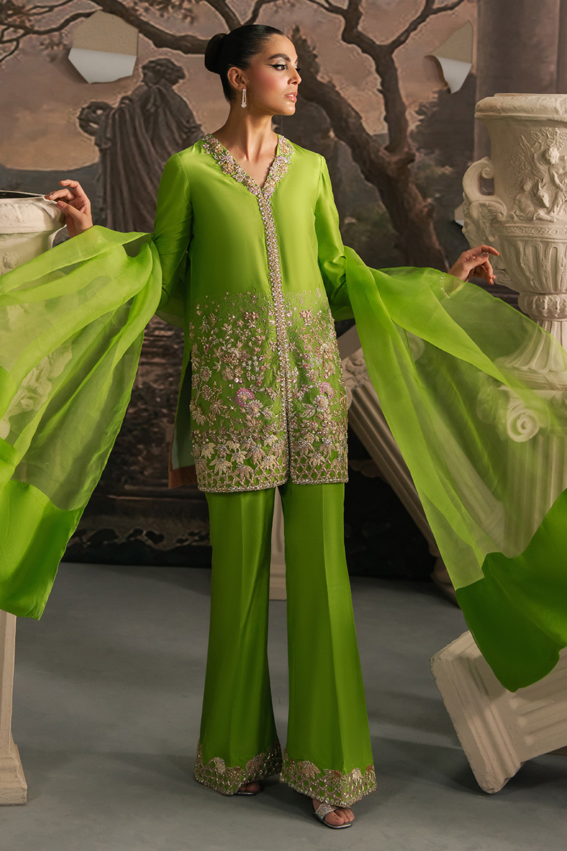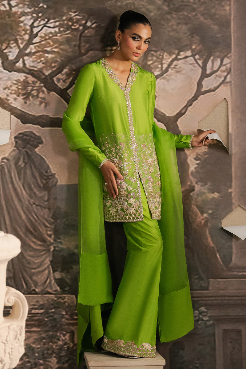 Reflecting the vibrancy of bold hues, Nerina is a spirited rendition of chic crafts. Cut from a grass green hue, the raw silk shirt and boot-cut pants feature exquisitely arranged pearls, crystals, and sequin floral patterns. Elevating the look further is the delicately adorned diaphanous organza dupatta, making this ensemble the perfect pick to celebrate any special moment.