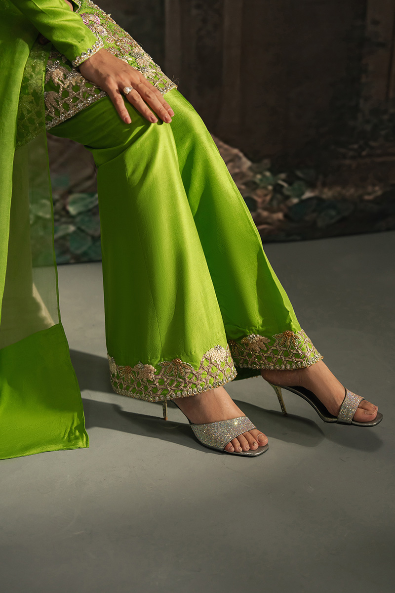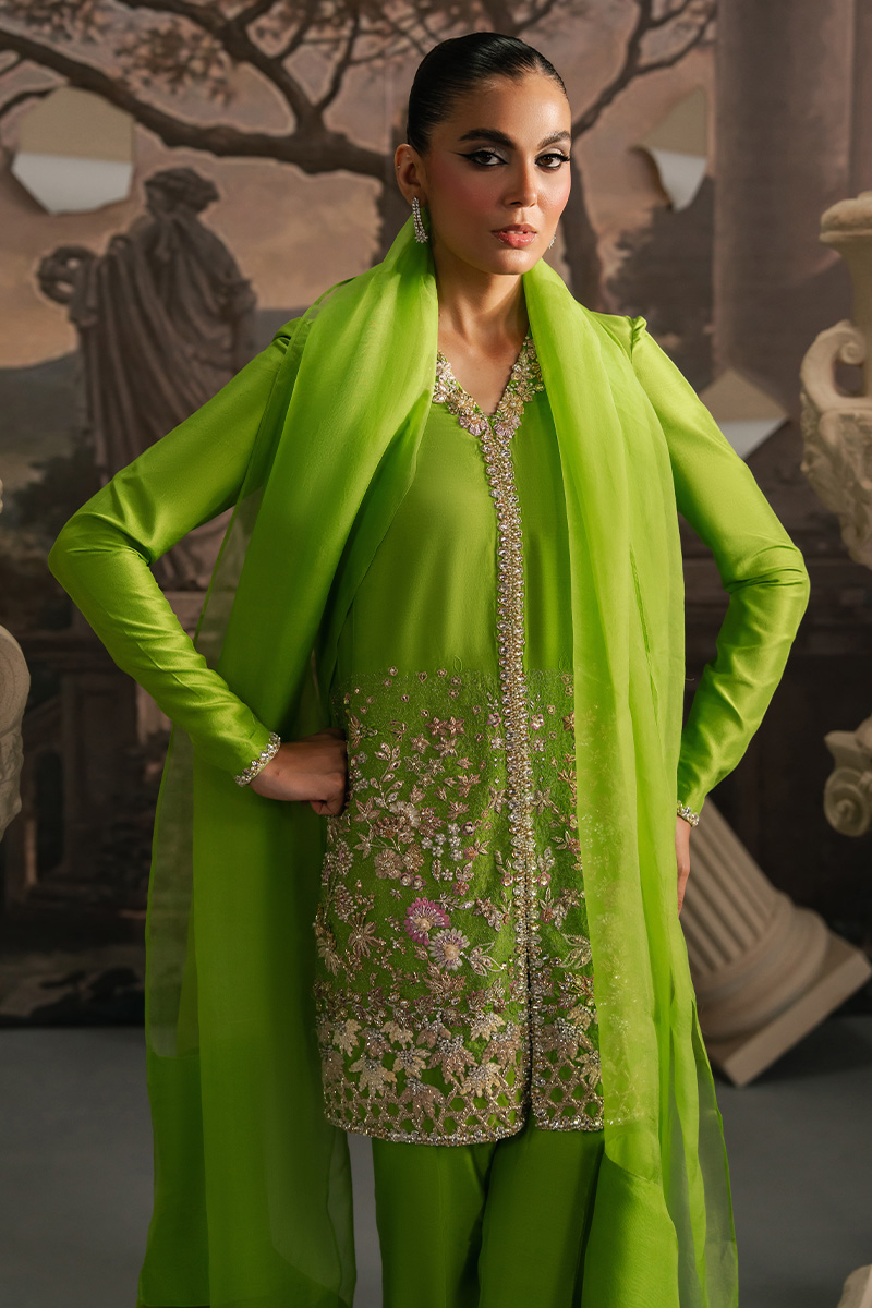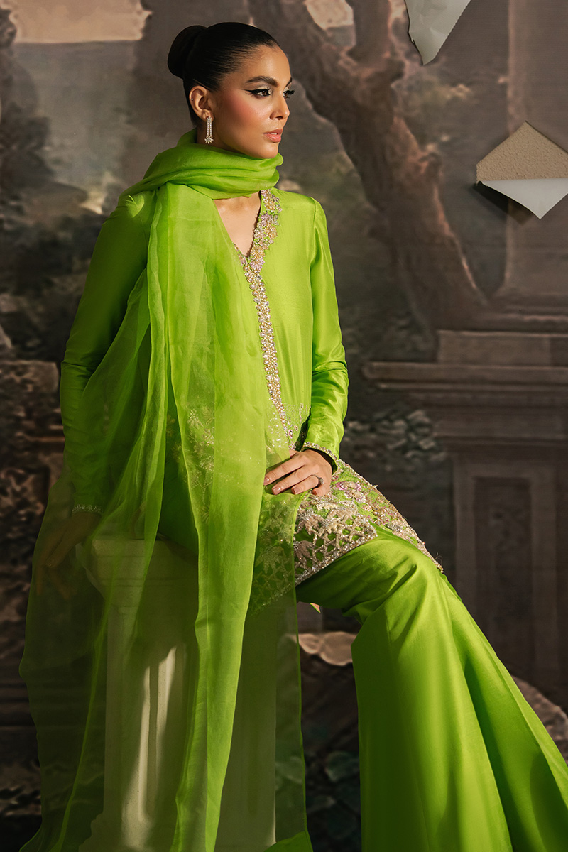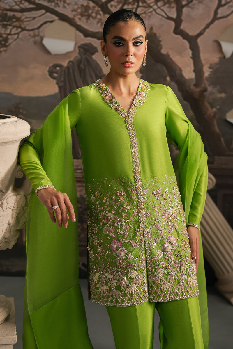 Reflecting the vibrancy of bold hues, Nerina is a spirited rendition of chic crafts. Cut from a grass green hue, the raw silk shirt and boot-cut pants feature exquisitely arranged pearls, crystals, and sequin floral patterns. Elevating the look further is the delicately adorned diaphanous organza dupatta, making this ensemble the perfect pick to celebrate any special moment.