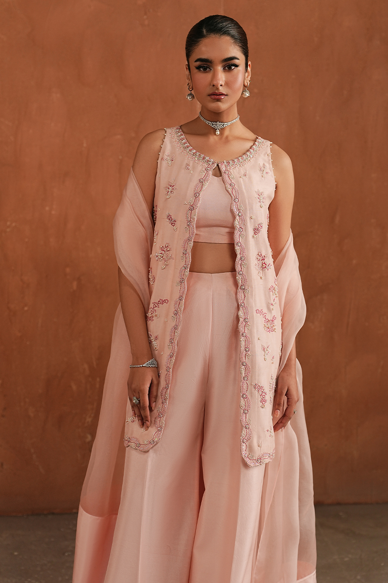 Crafted in Tussle Silk, Peony is defined by delicate adda work and an easy sense of movement. The open jacket brings form without weight, paired with softly flared trousers and a sheer organza dupatta that falls naturally. A look that moves comfortably between intimate moments and evenings that unfold at their own pace.