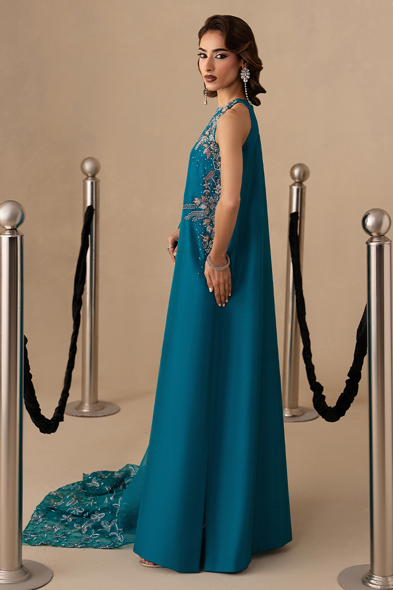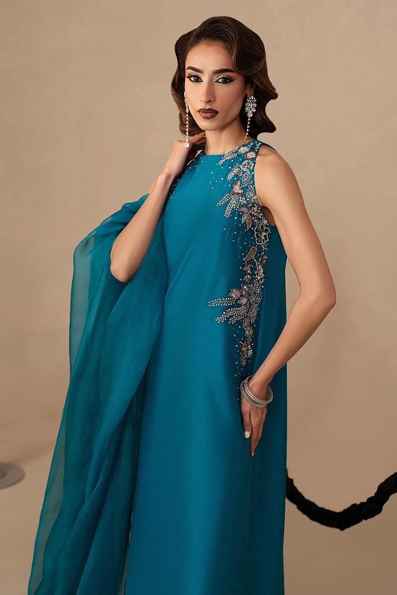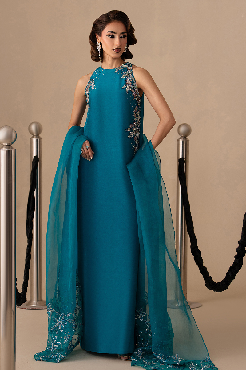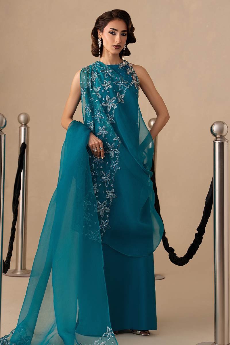 Finished with an organza dupatta edged in machine embroidery and paired with straight trousers, the look captures Eid elegance in its most confident, understated form.