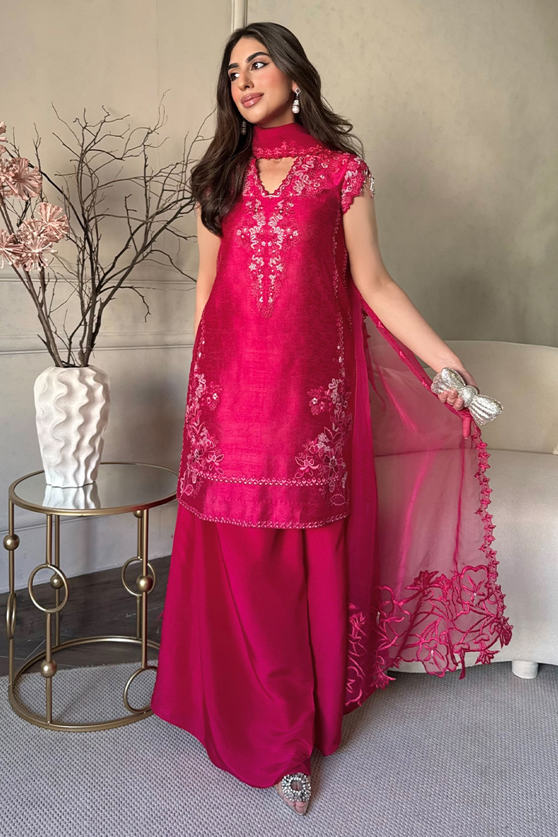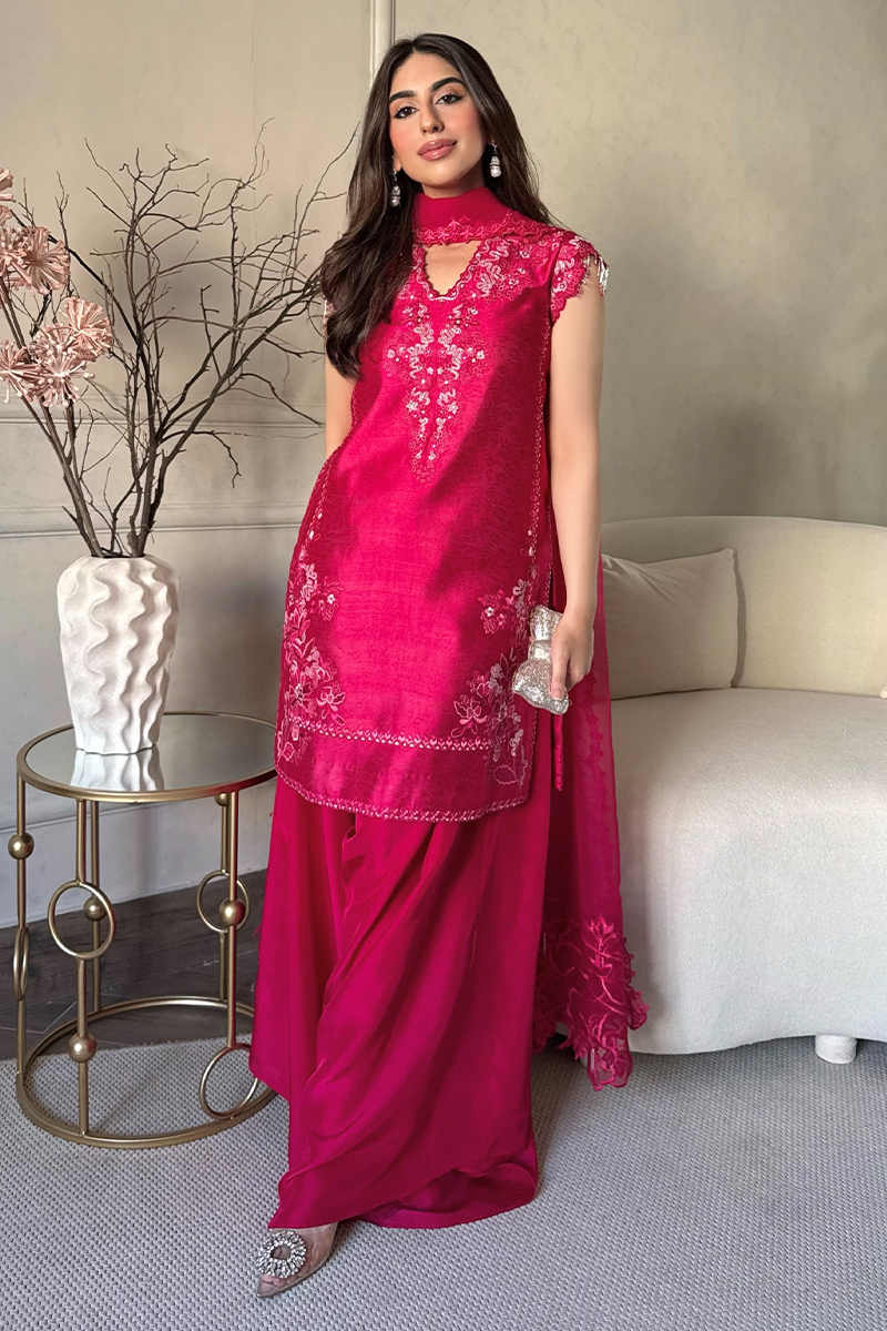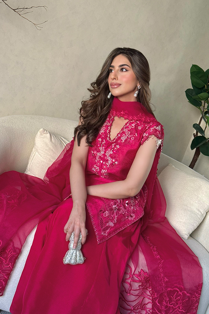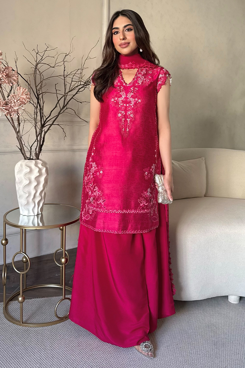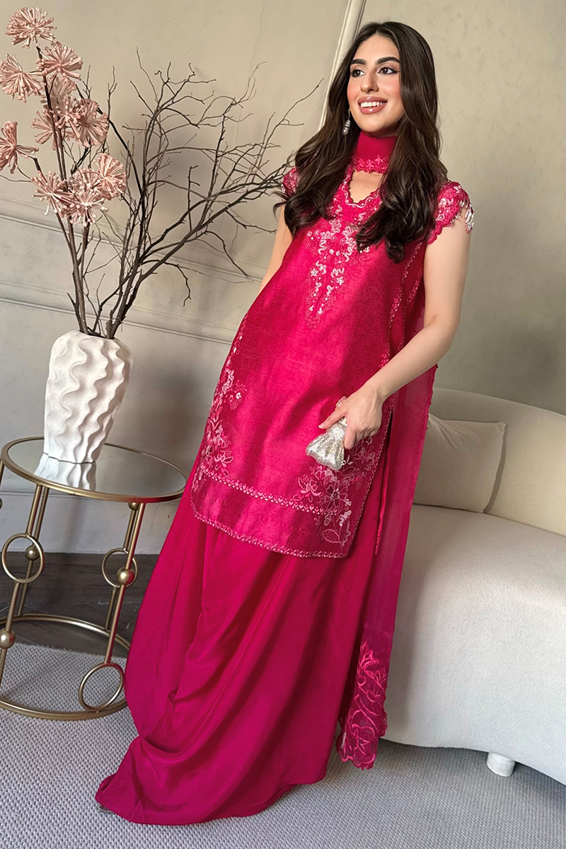Eid with Khakaa A striking hot pink ensemble crafted in self Sheesha Silk, featuring a fully embroidered and embellished neckline and borders. Designed with cap sleeves and tassel details for a refined touch. Paired with flowy Shamose Silk dhaka pants and an embroidered organza dupatta, this look blends elegance with festive charm.