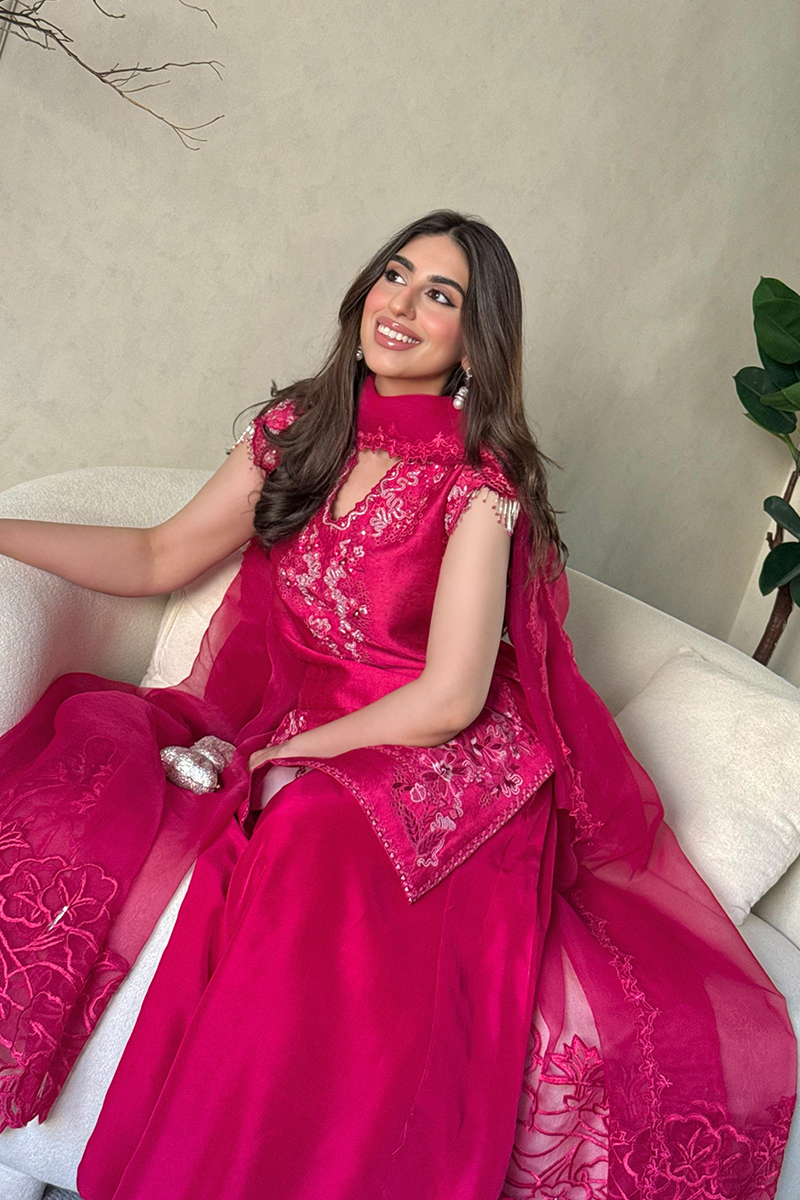 A striking hot pink ensemble crafted in self Sheesha Silk, featuring a fully embroidered and embellished neckline and borders. Designed with cap sleeves and tassel details for a refined touch. Paired with flowy Shamose Silk dhaka pants and an embroidered organza dupatta, this look blends elegance with festive charm.