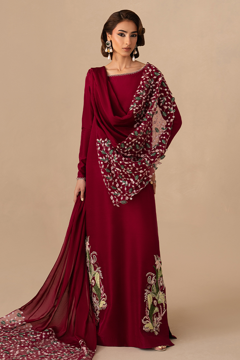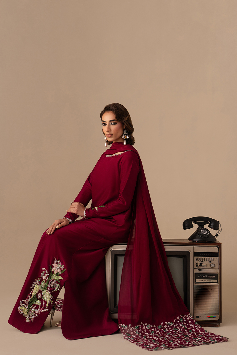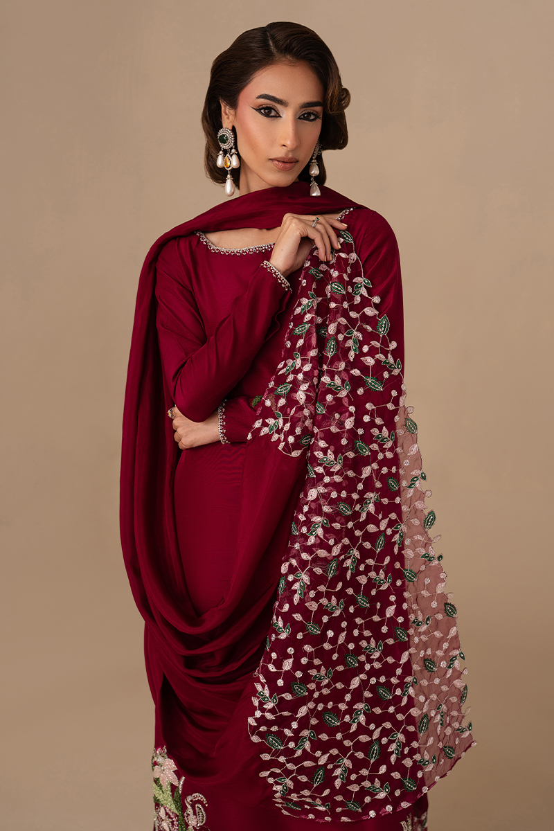 The Pure Raw Silk/Korean Raw Silk long shirt is elevated with hand embellishment on the neckline and a single embellished sleeve, paired with straight trousers and a medium silk dupatta finished with machine-embroidered borders.