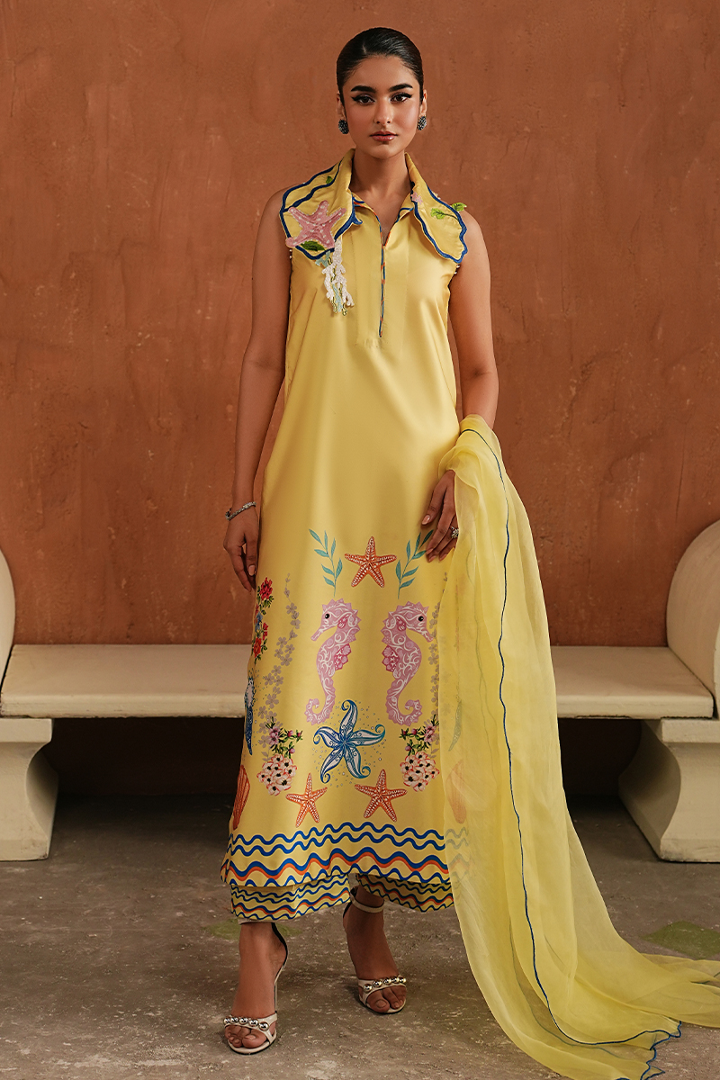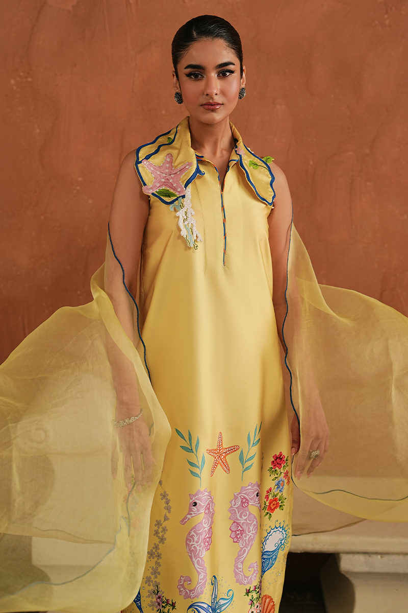 Love this article for its thoughtful details and easy character. Crafted in yellow printed Shamoze Silk, the long shirt is paired with relaxed culottes for movement and comfort. The collar is a true highlight, detailed with playful sea-life inspired elements that give the look its personality. Finished with an organza dupatta, embroidered along all four sides, this set is made for casual Ramadan evenings, daytime gatherings, and moments when you want something light yet distinctive.