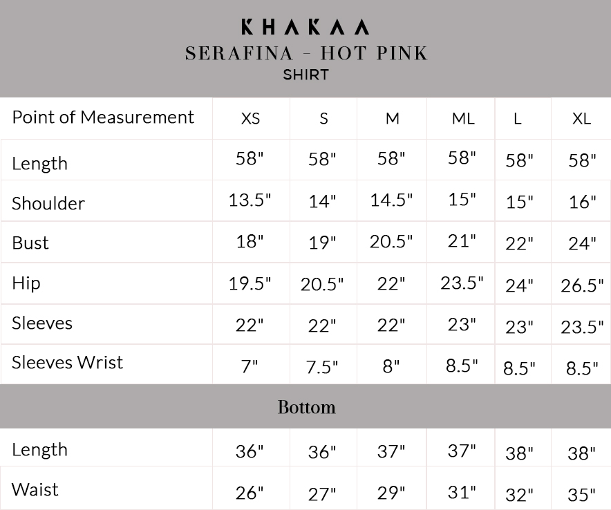 In a bold hot pink, Serafina features a full-length sleek shirt with straight cigarette pants, paired with an organza dupatta with motif spray. The ensemble is adorned with hand embellishments of pearls, beads, swarovski crystals, and tilla, finished with an intricately detailed net neckline, a radiant expression of modern luxury.