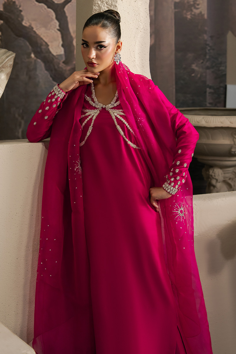 In a bold hot pink, Serafina features a full-length sleek shirt with straight cigarette pants, paired with an organza dupatta with motif spray. The ensemble is adorned with hand embellishments of pearls, beads, swarovski crystals, and tilla, finished with an intricately detailed net neckline, a radiant expression of modern luxury.