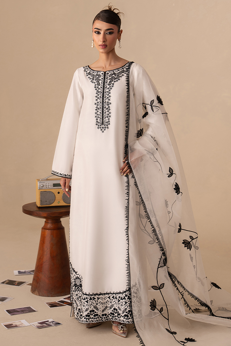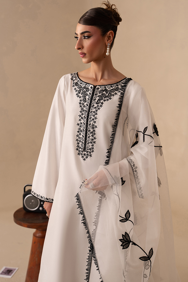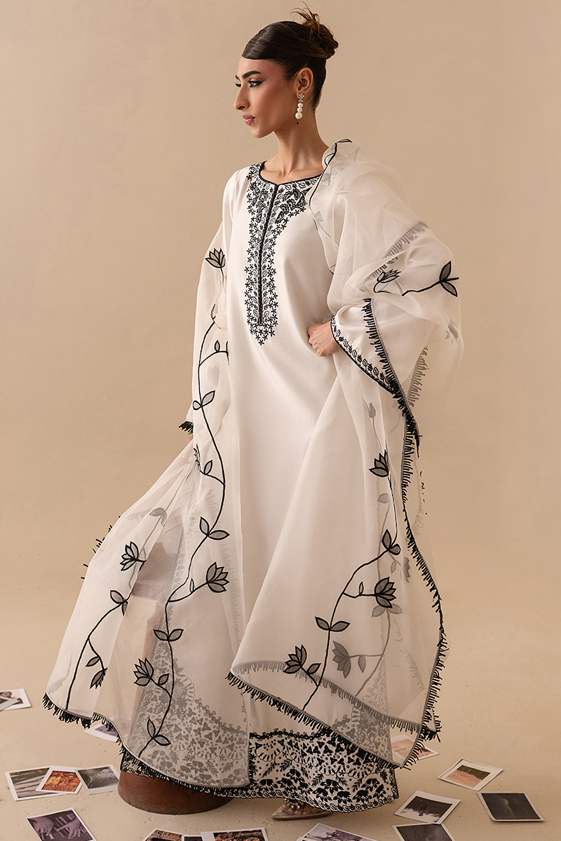 An organza dupatta, finished with delicate machine embroidery, completes the look with quiet grace for Ramadan evenings.