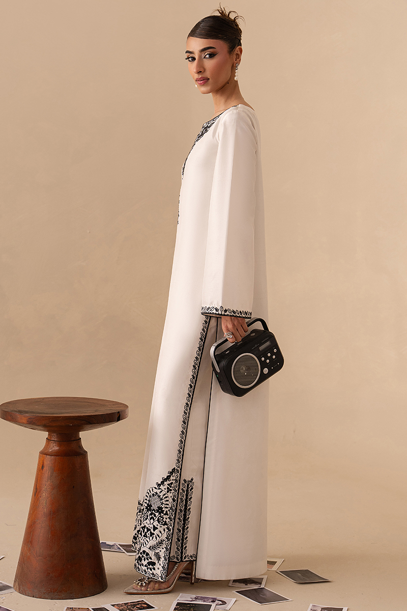 Cut from Korean raw silk, the silhouette is detailed with machine embroidery along the neckline, sleeves, and borders, while the trousers feature subtle embroidered slits for a refined finish.