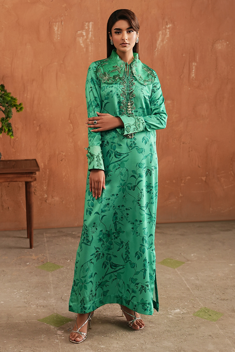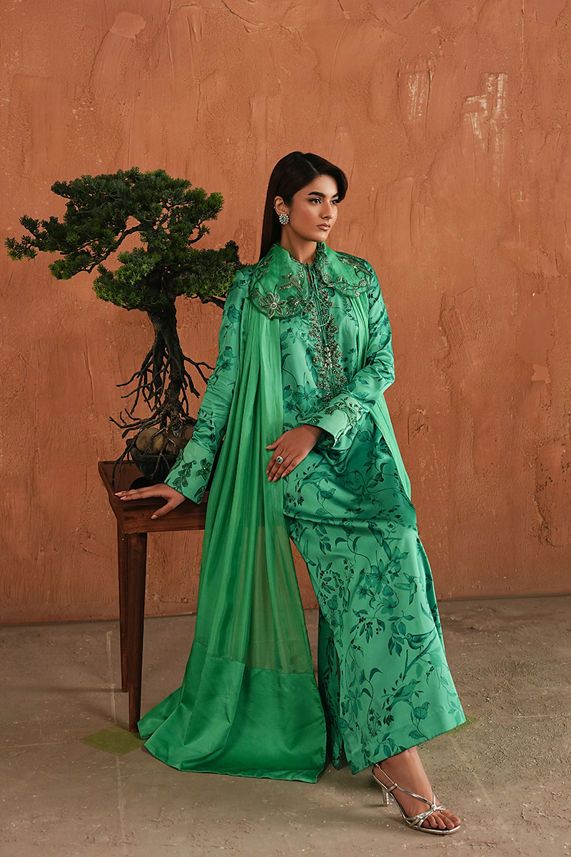 The collar sets a confident foundation, followed by a neckline finished with intricate handwork that defines the look. Subtle detailing along the sleeves adds depth to the green printed Shamoze Silk shirt, paired with straight trousers for a clean, balanced silhouette. Finished with a plain medium silk dupatta, Syla stands out as a key piece for Ramadan evenings that call for refinement, craftsmanship, and quiet confidence.