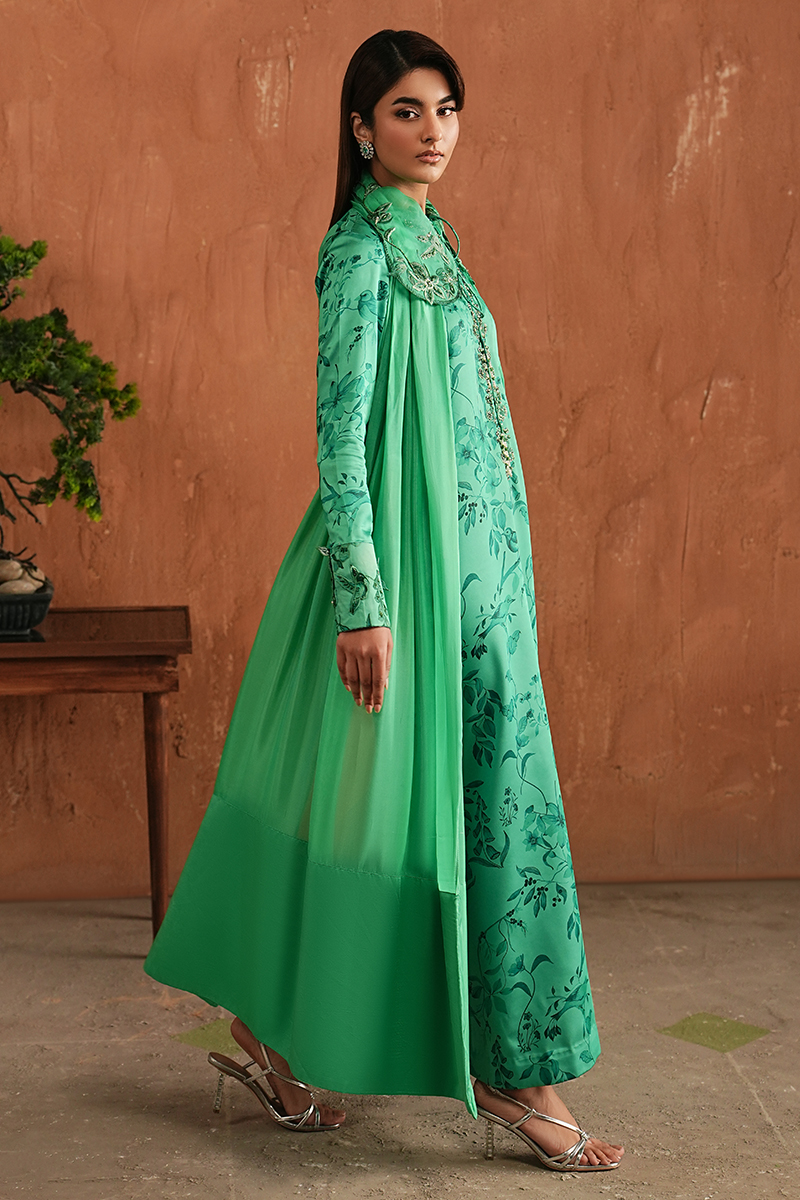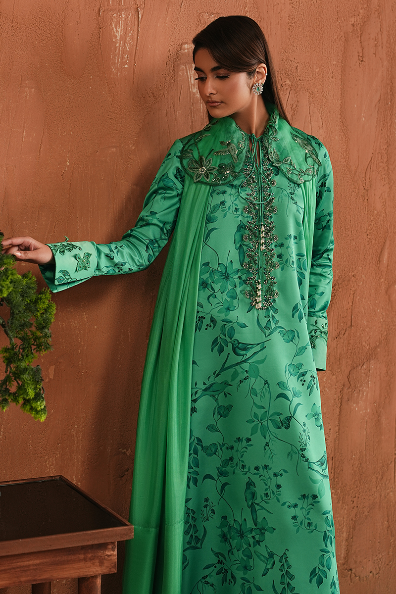 The collar sets a confident foundation, followed by a neckline finished with intricate handwork that defines the look. Subtle detailing along the sleeves adds depth to the green printed Shamoze Silk shirt, paired with straight trousers for a clean, balanced silhouette. Finished with a plain medium silk dupatta, Syla stands out as a key piece for Ramadan evenings that call for refinement, craftsmanship, and quiet confidence.