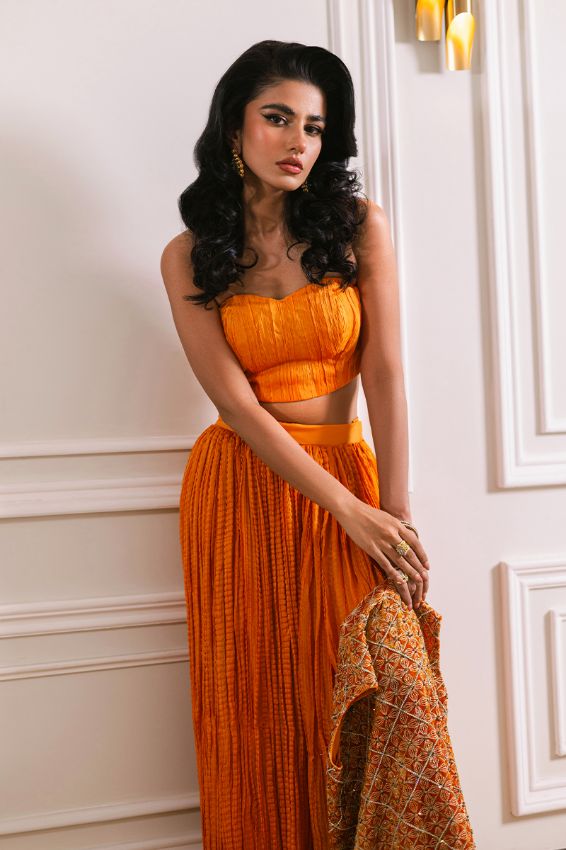 This exquisite outfit showcases a stylish short jacket crafted from sumptuous velvet, featuring eye-catching embellishments that bring a stunning bling effect. The jacket’s sleek silhouette enhances the overall look, making it a standout piece. Paired with a crushed sharara, the ensemble exudes elegance and movement, allowing for graceful flow with every step. The crushed bustier in medium silk complements the jacket beautifully, providing a flattering fit and adding a touch of luxury. Perfect for festive occasions or upscale events, this outfit combines rich textures and intricate details, ensuring you make a memorable impression with every wear.