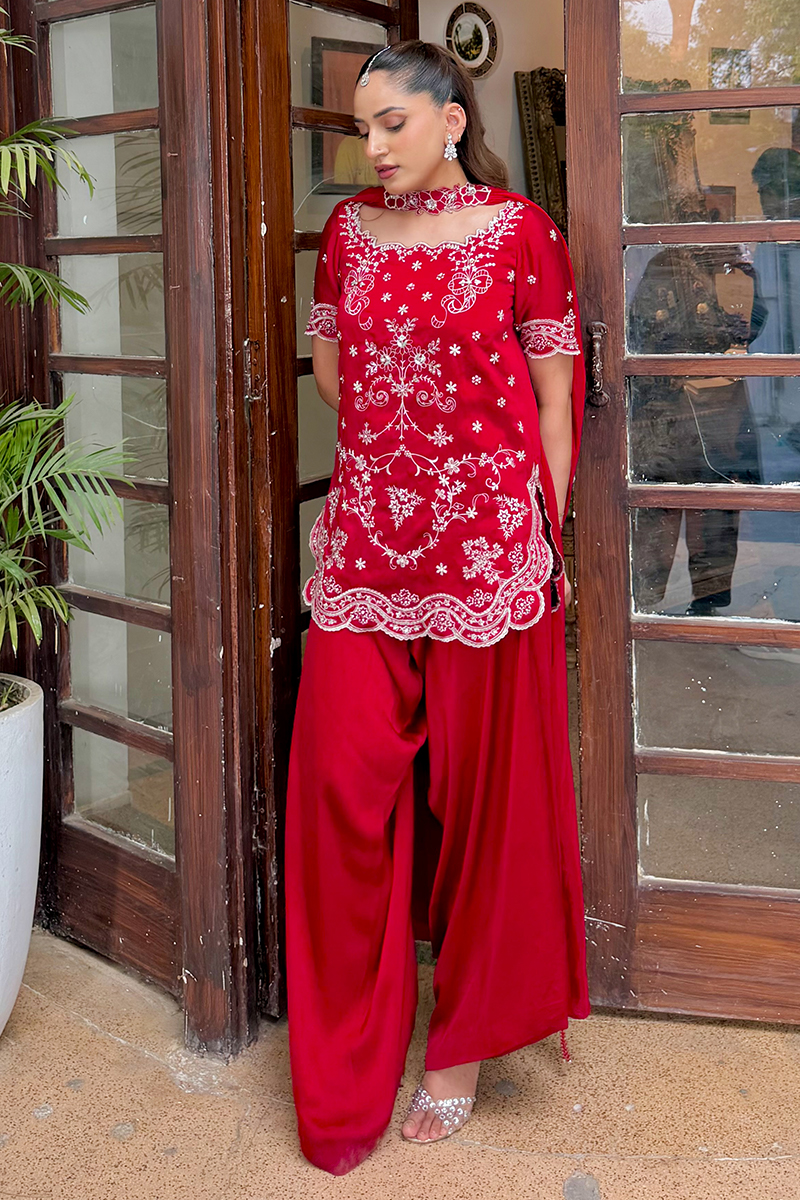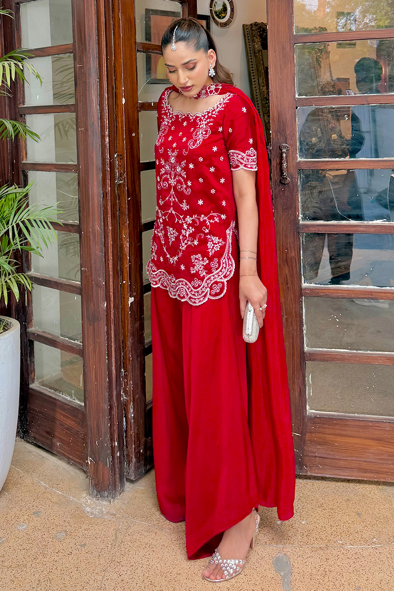 A red Sheesha Silk short shirt, detailed with delicate white embroidery and pearl work, paired with matching red dhaka pants that create a timeless, structured silhouette. The medium silk dupatta completes the look, adorned with soft motifs that catch the light in just the right way.
