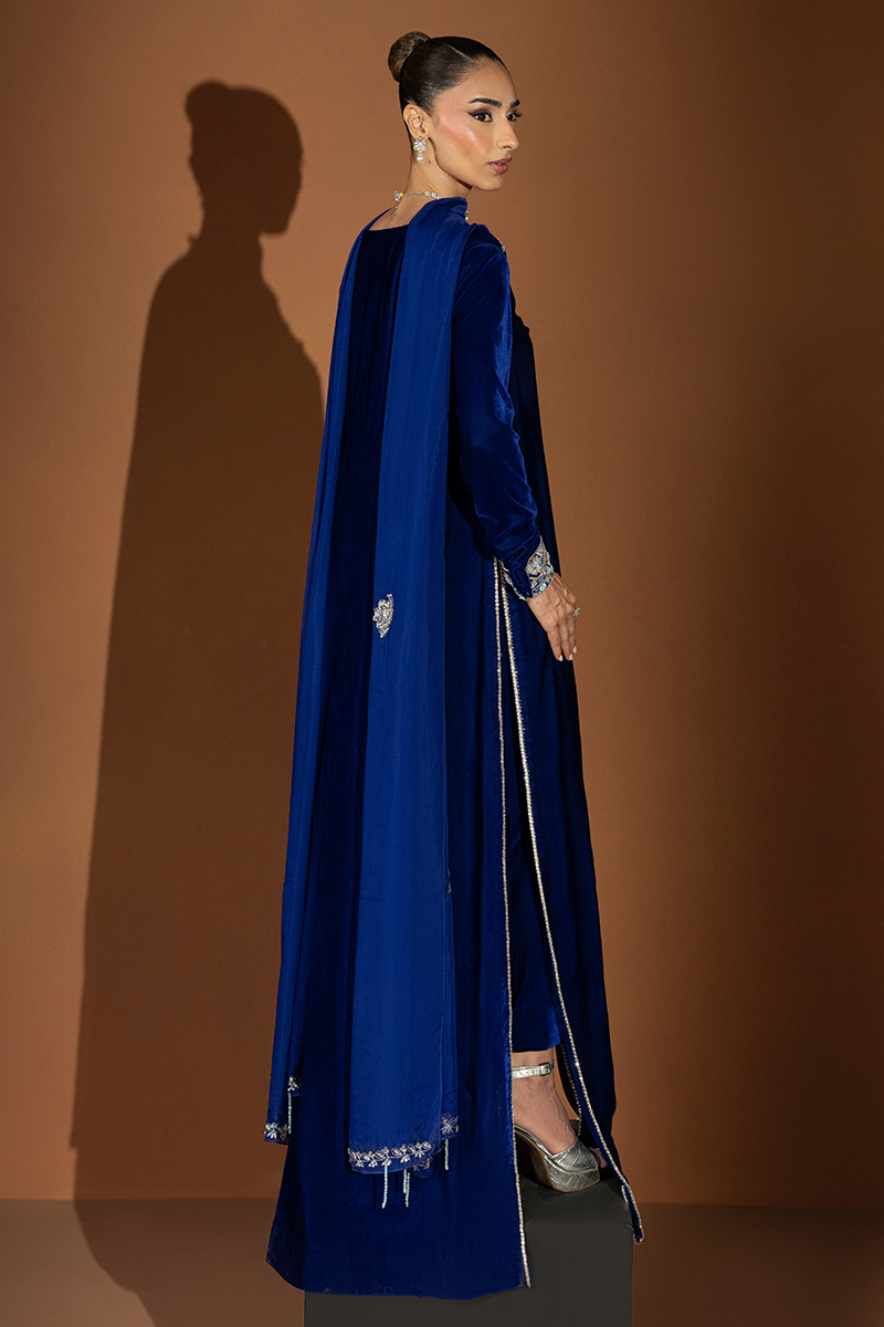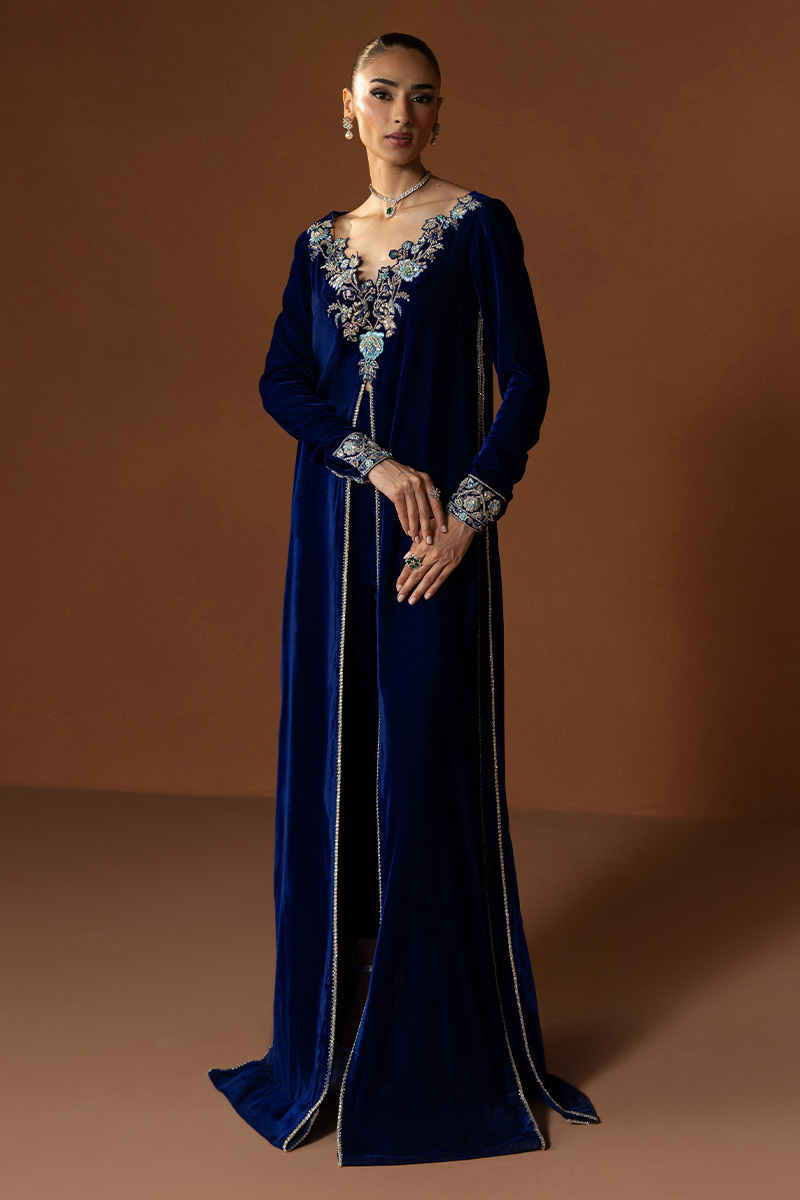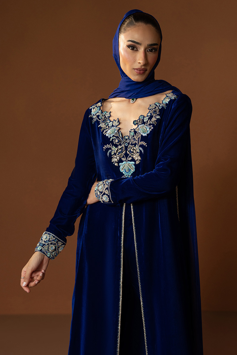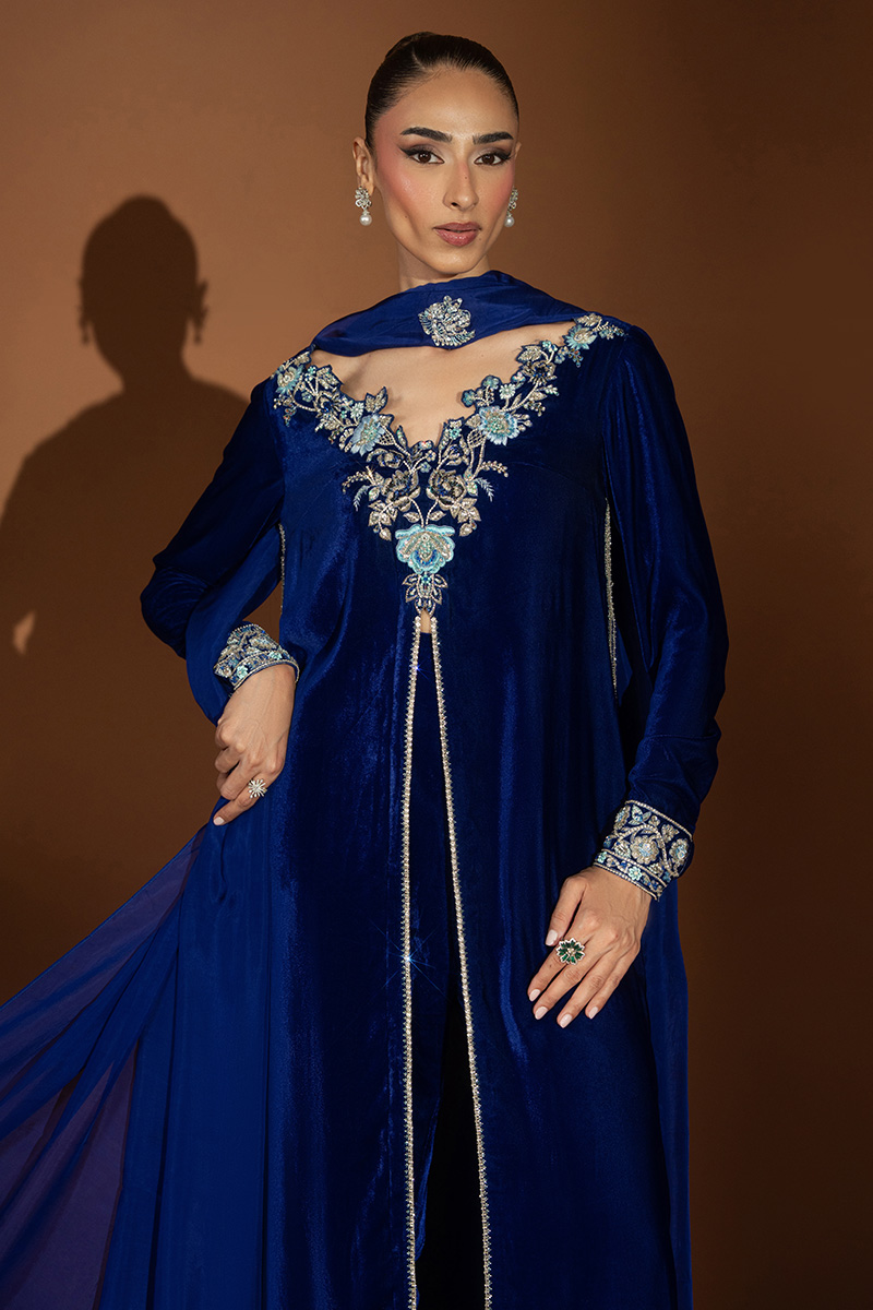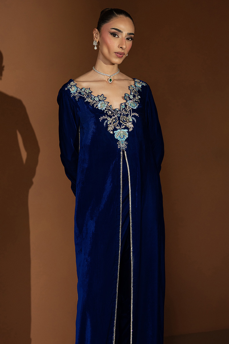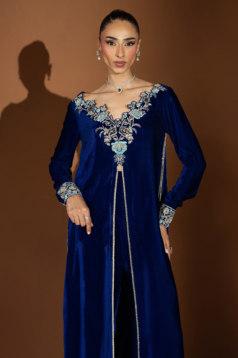 In a serene royal hue of blue, this velvet outfit speaks of quiet grace. The long front-open shirt is detailed with delicate cutwork floral detailing along the neckline and refined accents on the cuffs, creating a look of effortless grace. Paired with sleek cigarette pants, Vionna is a timeless expression of true elegance.