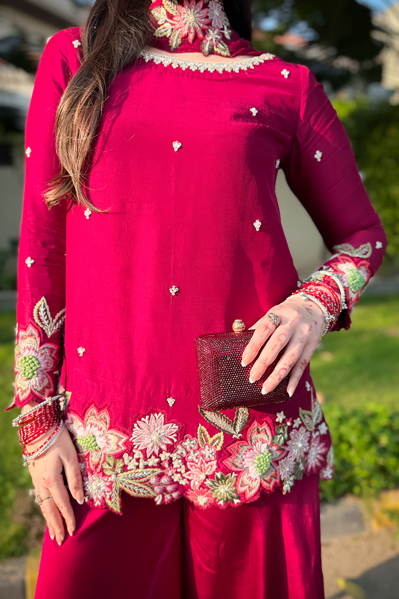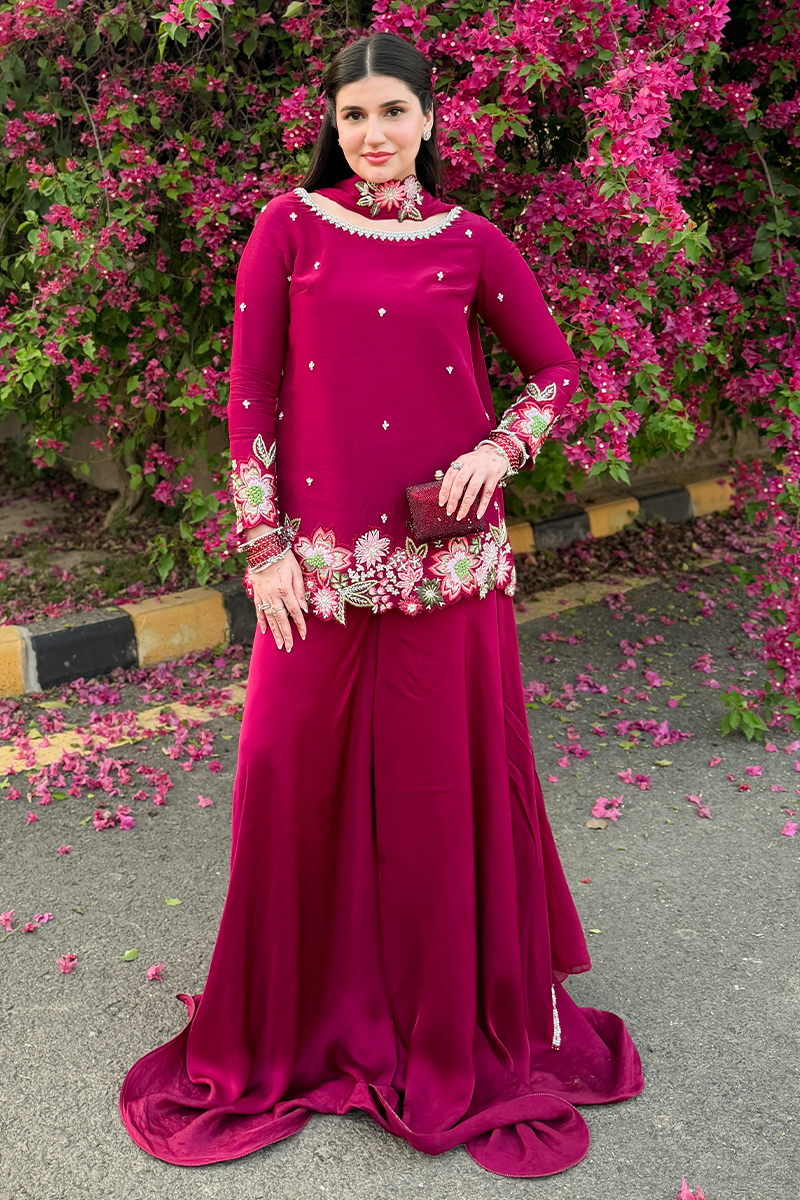 A short shirt with a delicately embellished neckline and fine borders sets the tone for Zoha, paired with flared sharara pants in rich Shamoze Silk for a graceful, festive flow. The look is completed with a medium silk dupatta, adorned with a subtle motif.