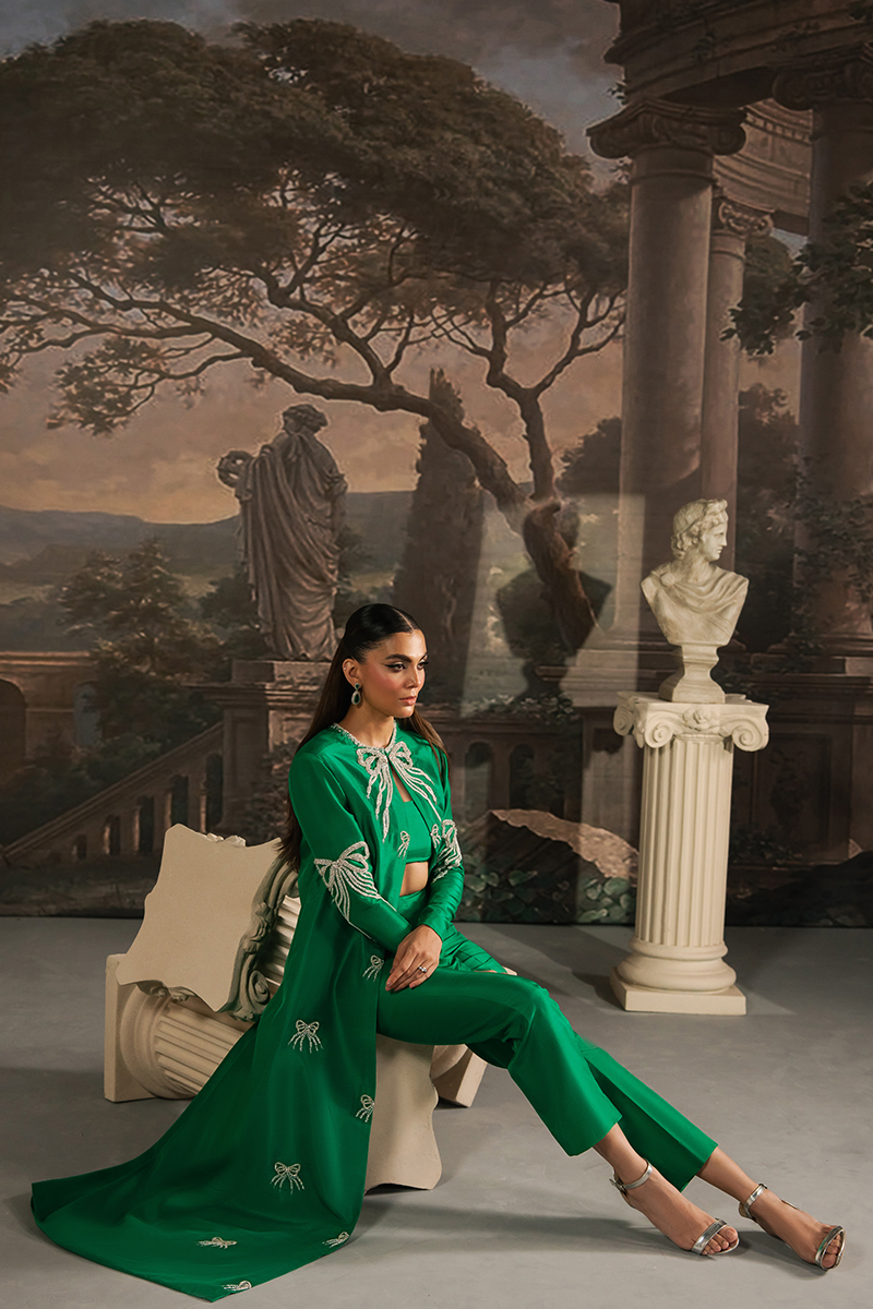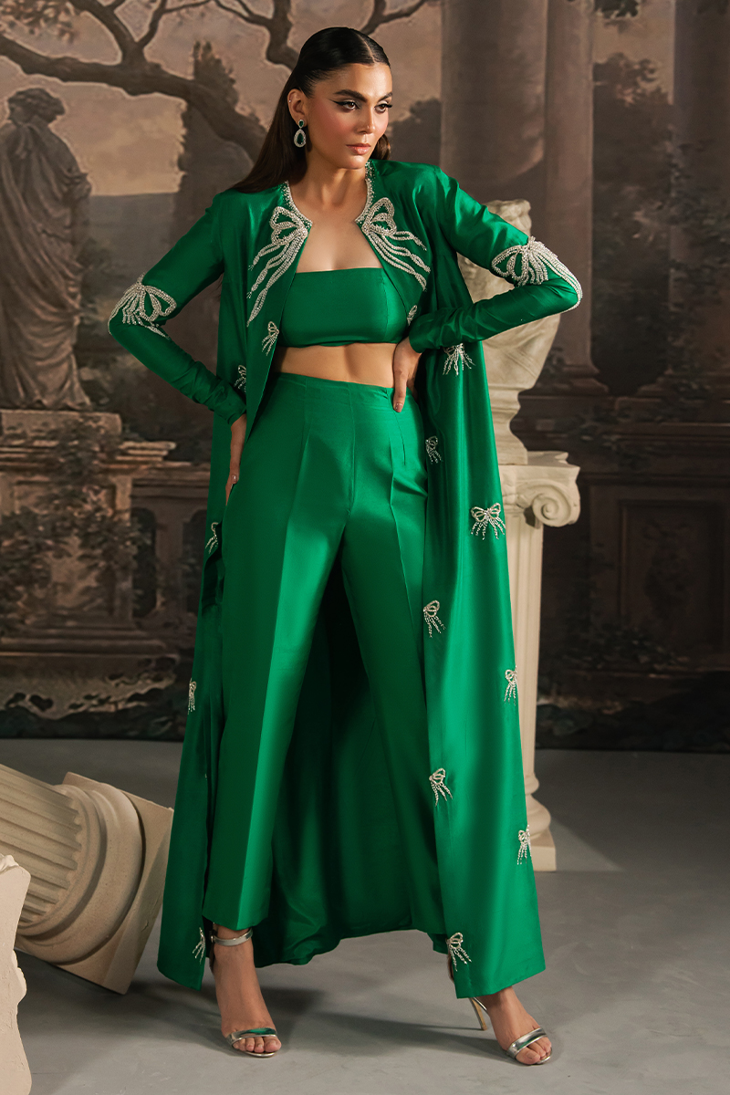 This elegant emerald green ensemble features a front-open shirt, beautifully adorned with intricate silver embellishments and a delicately worked neckline, further enhanced with shimmering sequin bowtie-Embellished motifs. Coordinated detailing graces the sleeves, while sleek raw silk cigarette pants complete the look with refined sophistication.